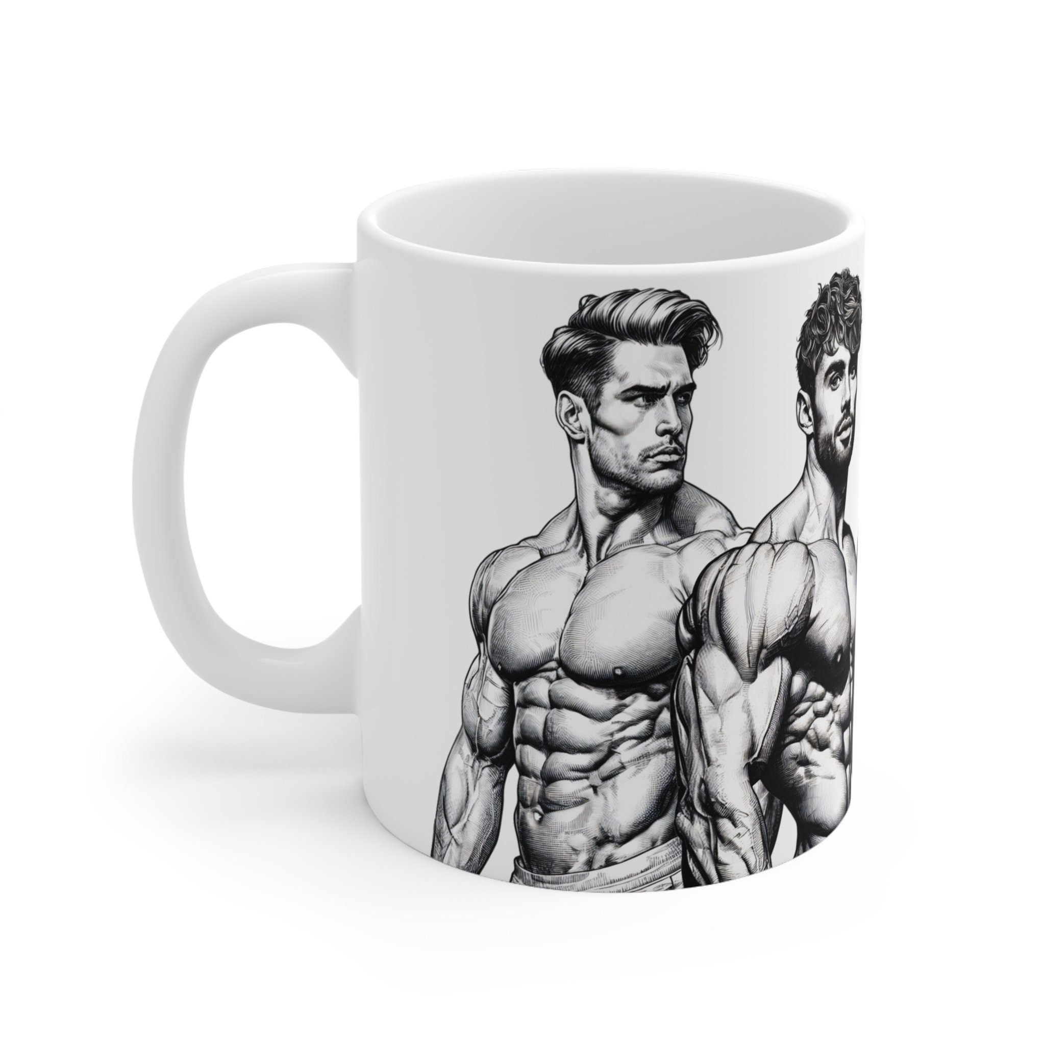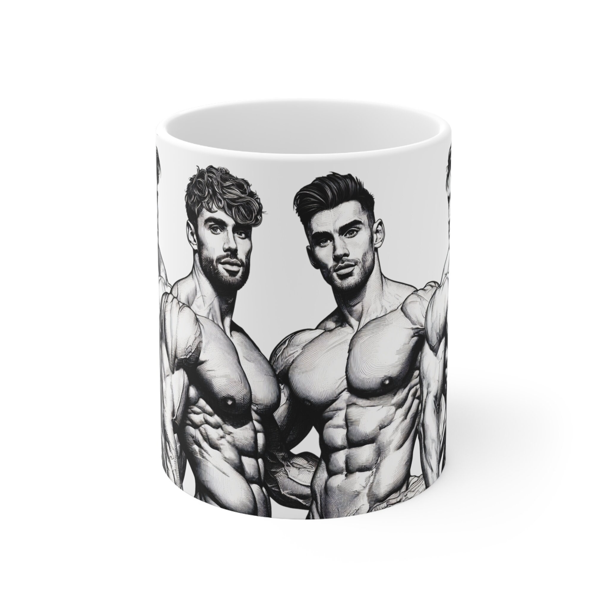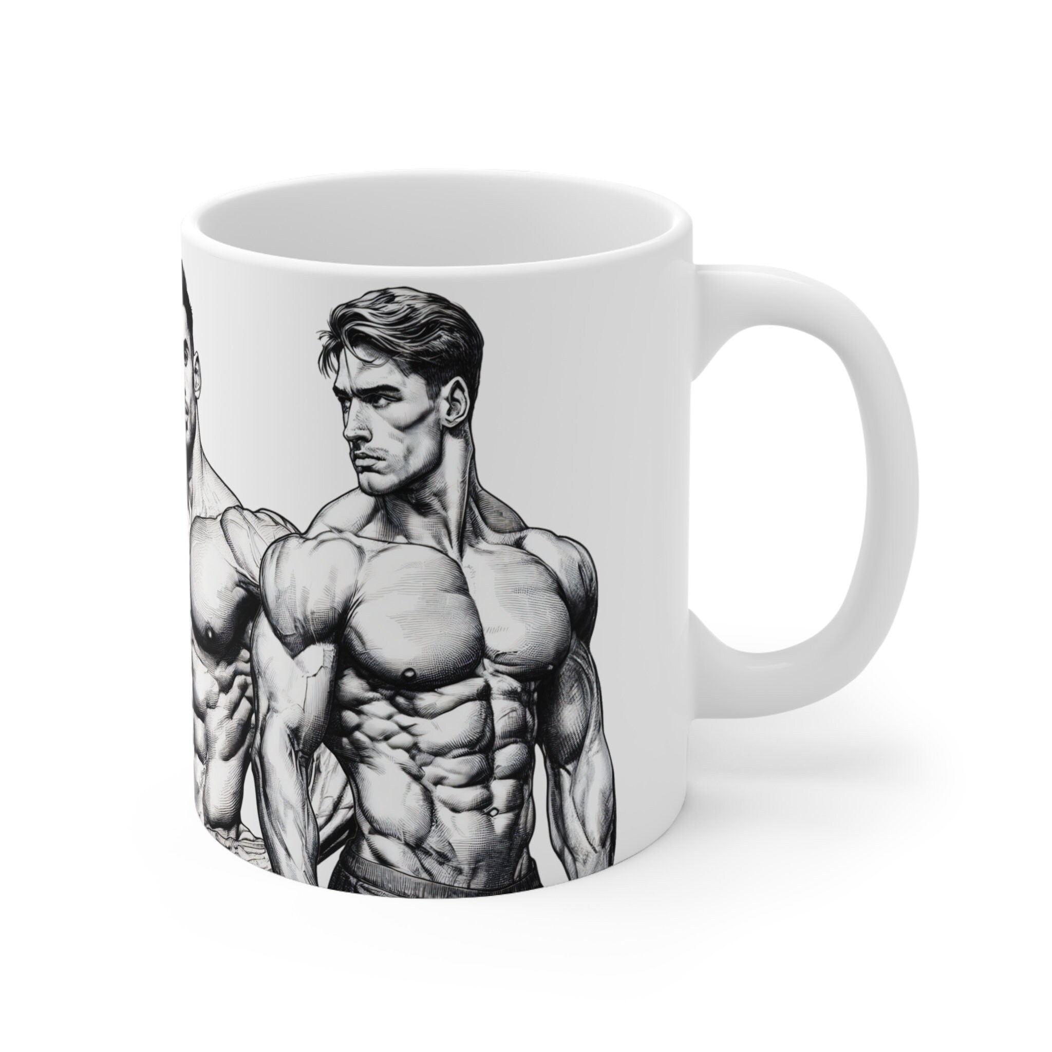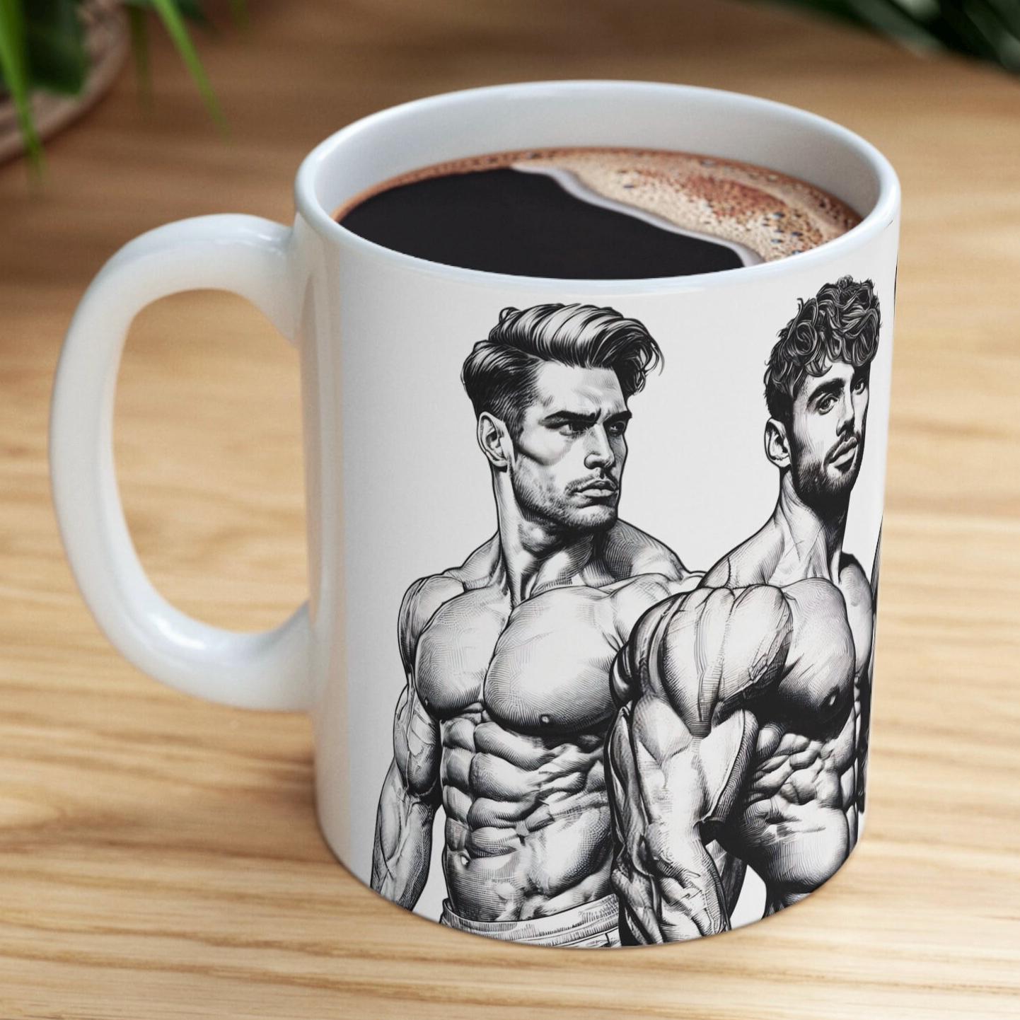 Get ready to flex your style muscles with our 11-ounce mug featuring eye-catching illustrations of muscular, handsome men. Elevate your coffee breaks or evening teas with this mug that's designed to bring a powerful and charismatic edge to your sips.