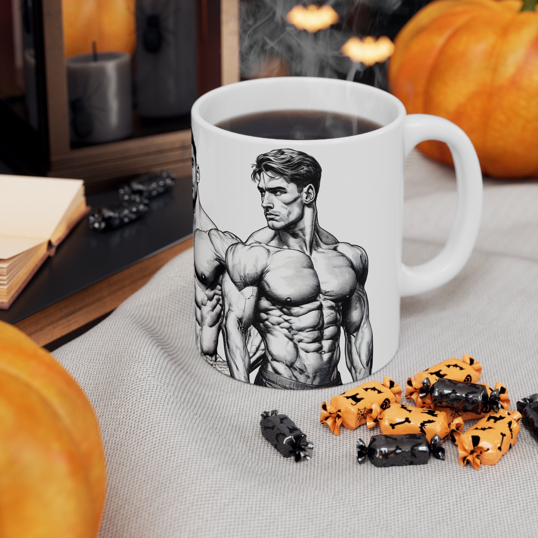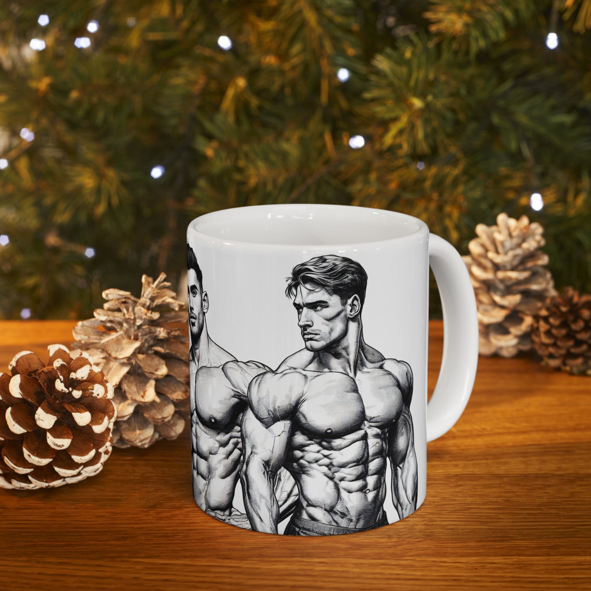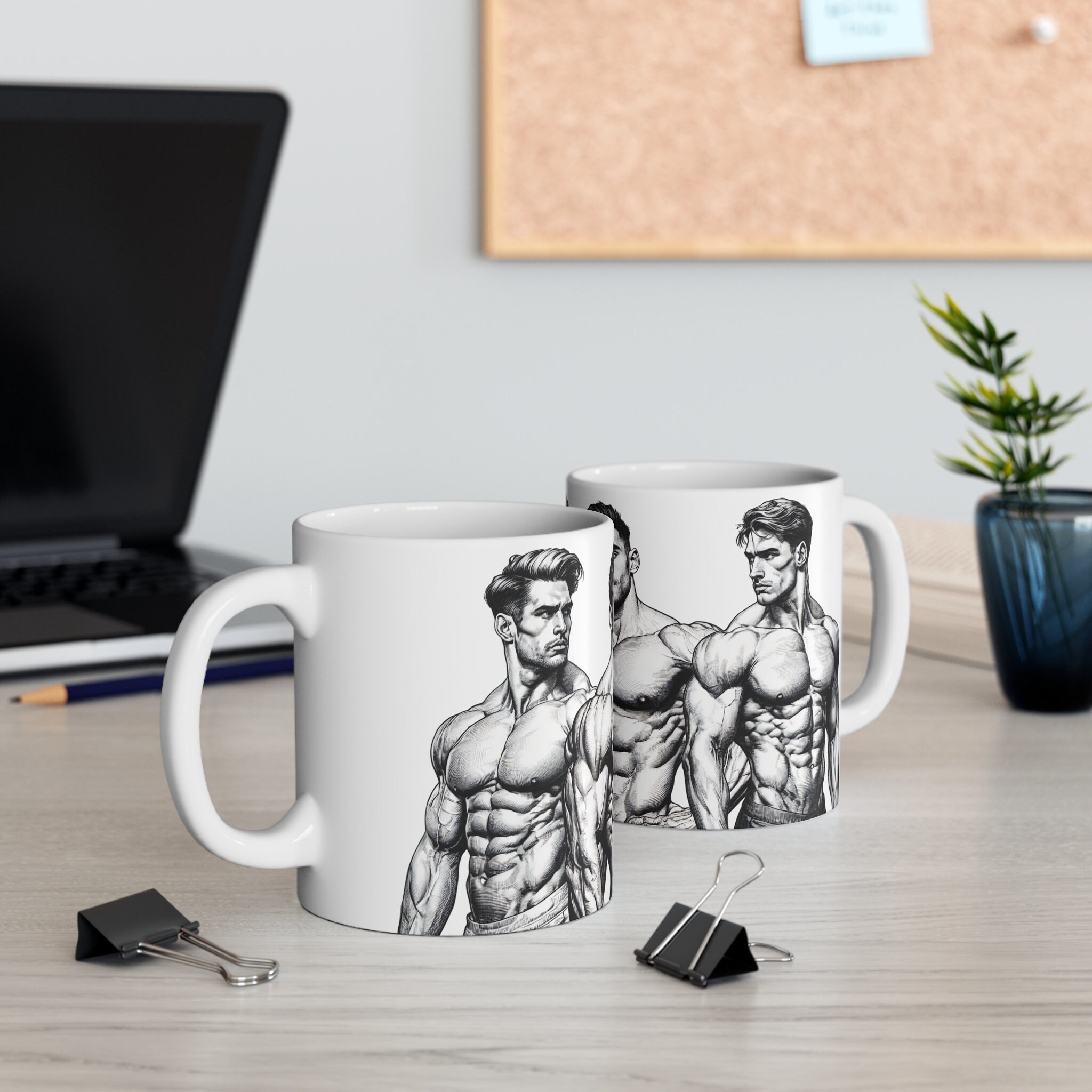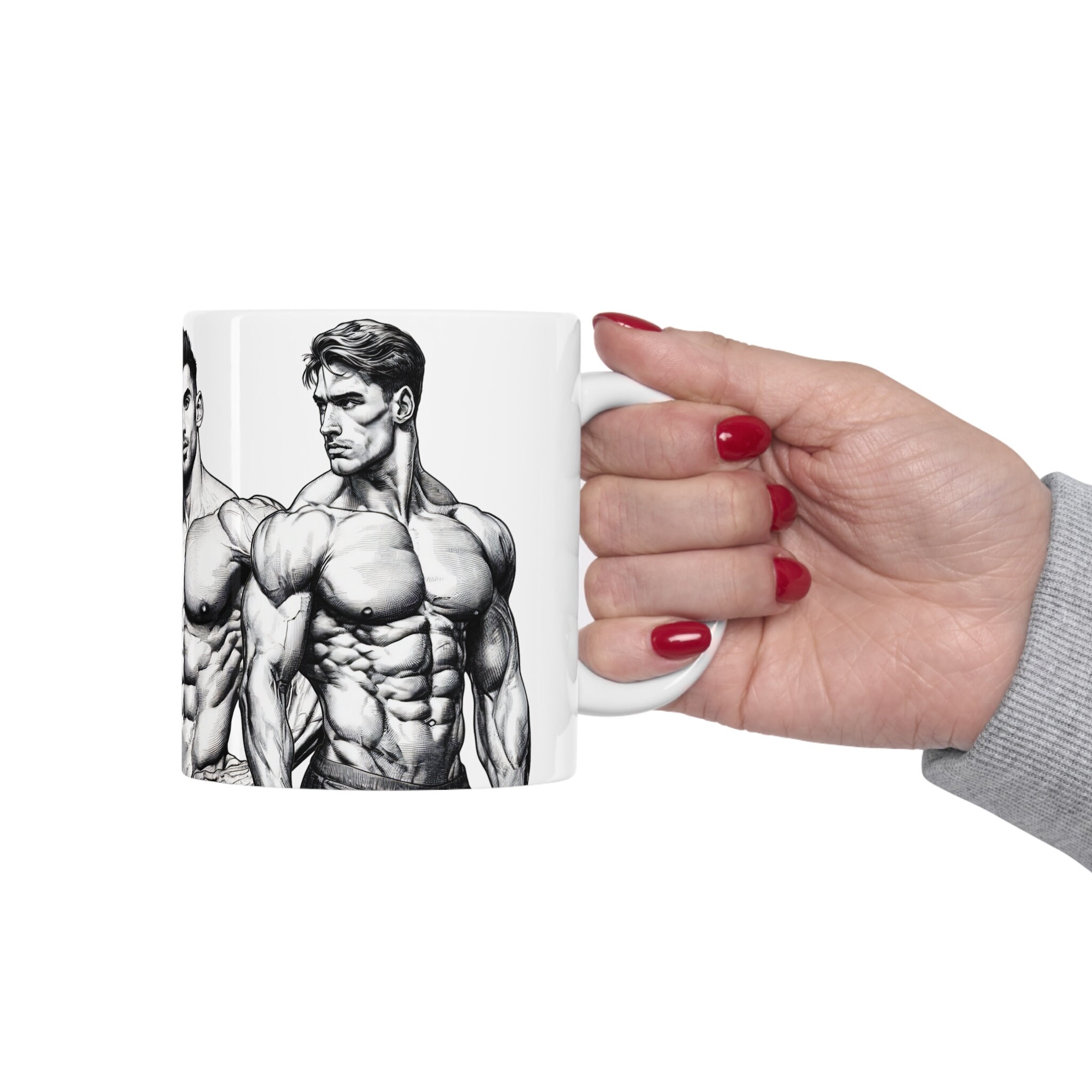 Get ready to flex your style muscles with our 11-ounce mug featuring eye-catching illustrations of muscular, handsome men. Elevate your coffee breaks or evening teas with this mug that's designed to bring a powerful and charismatic edge to your sips.