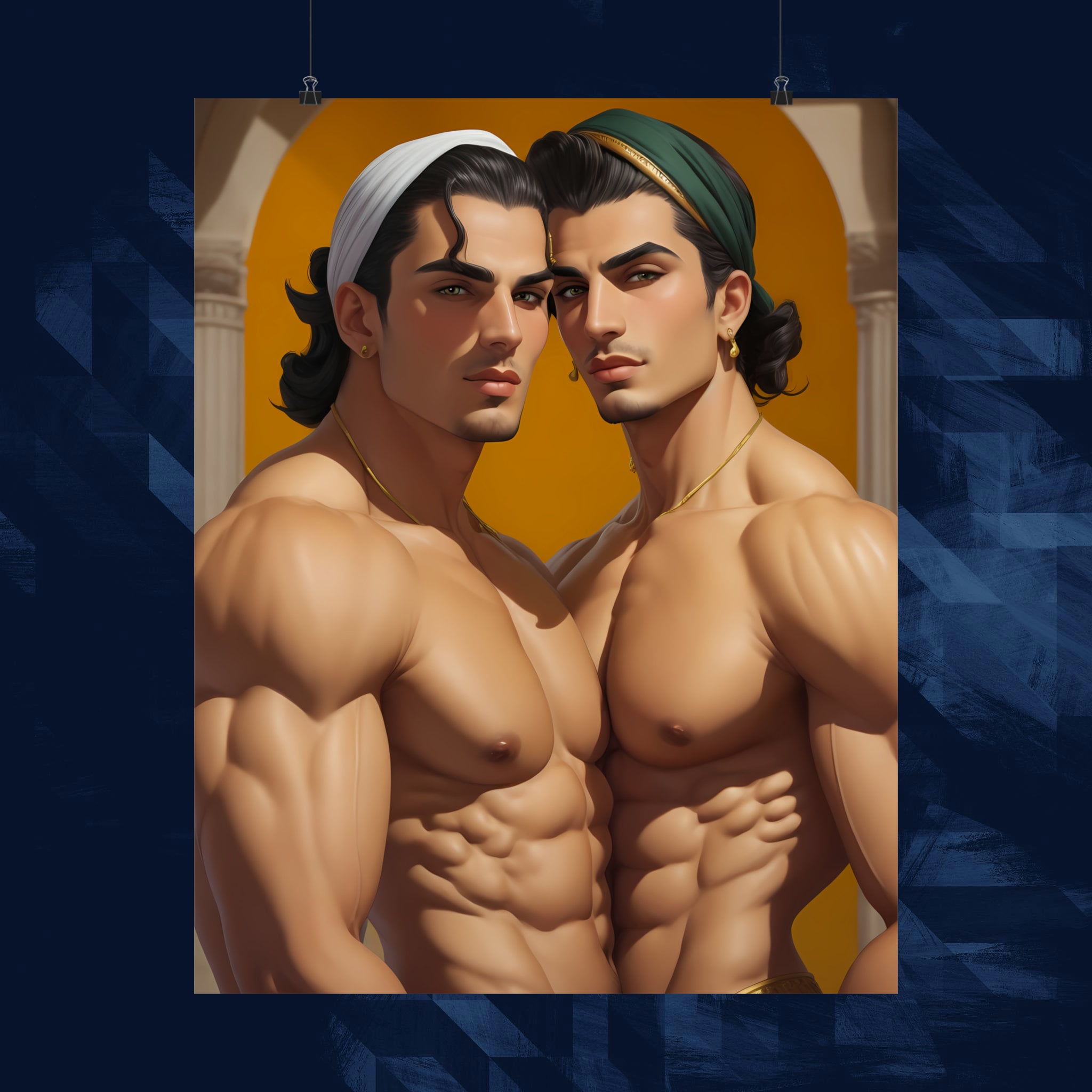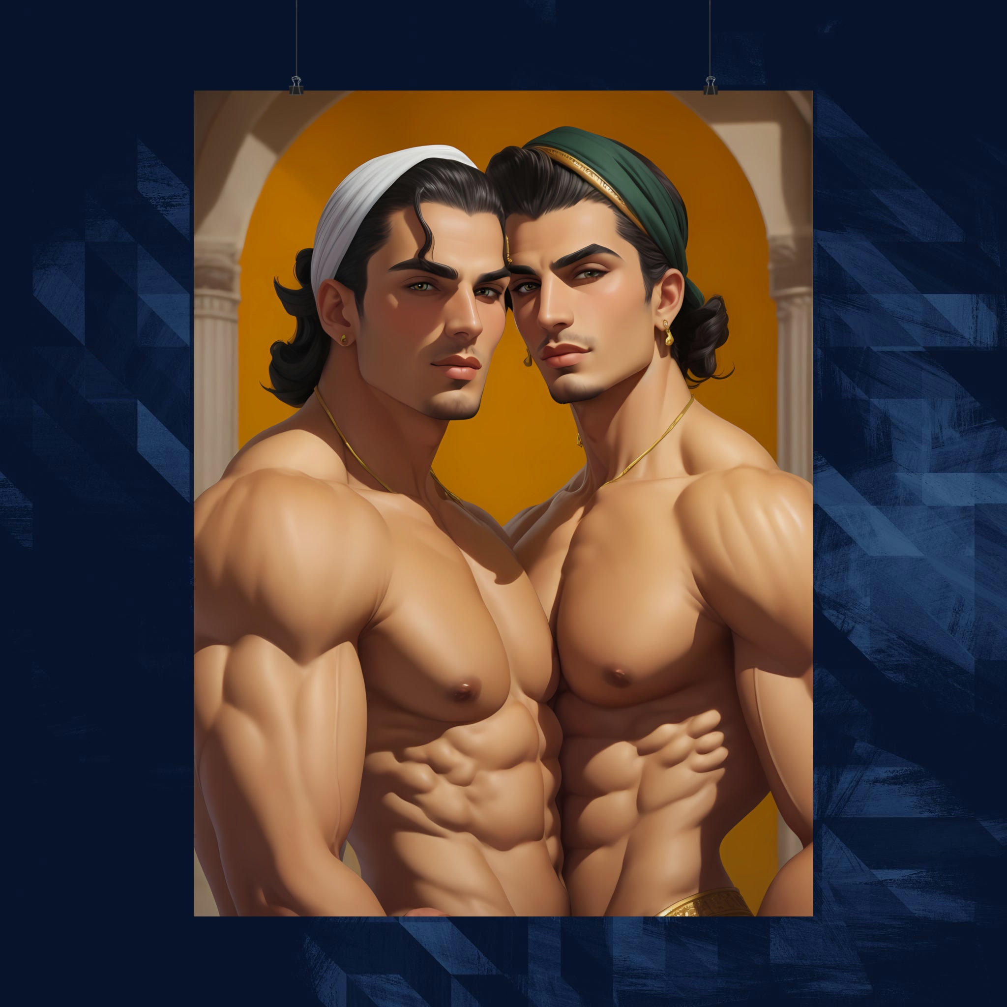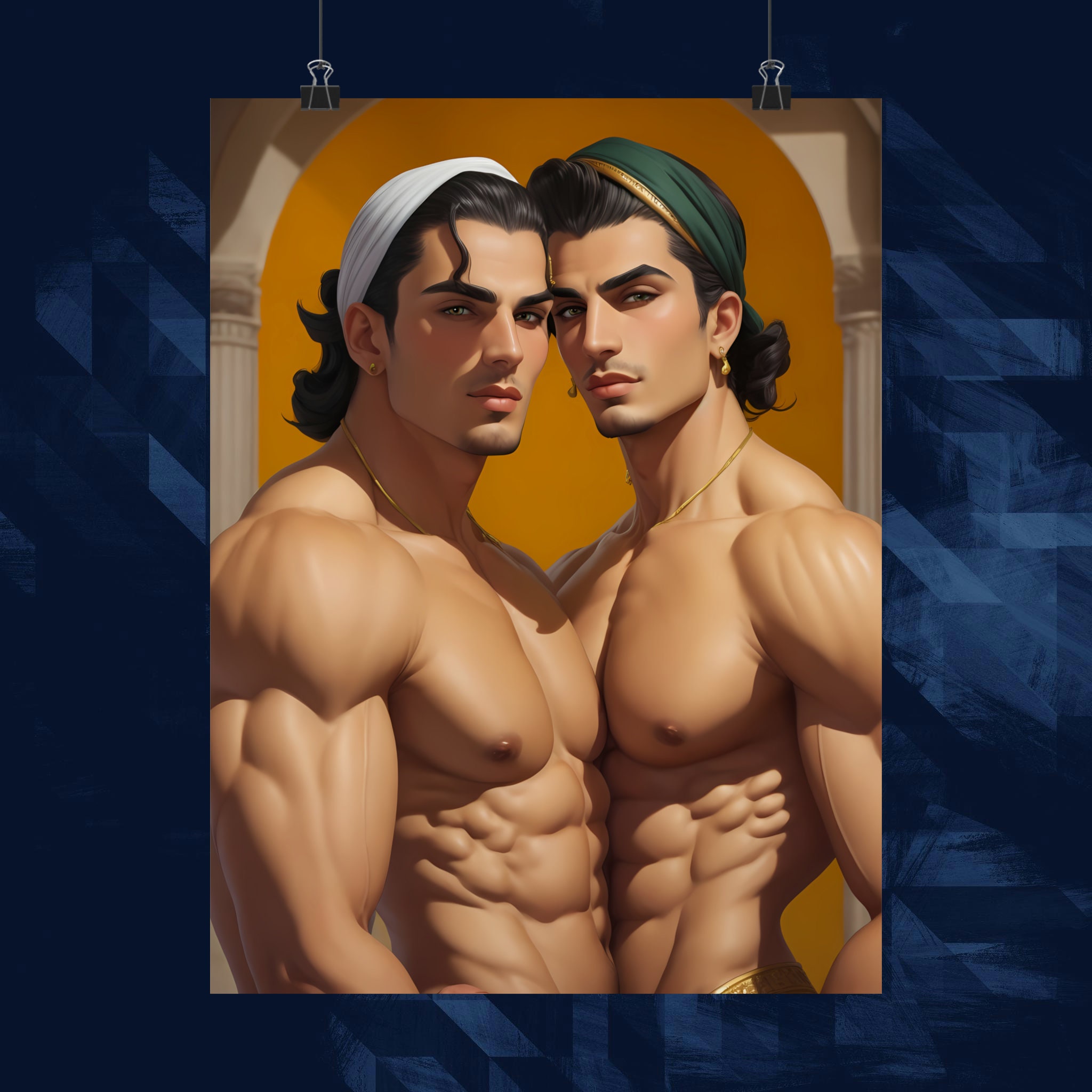 Elevate your space with our premium matte vertical posters showcasing a captivating Art Deco-style portrayal of a muscular and radiant gay couple. Crafted on museum-grade paper (175gsm fine art paper), these posters transform digital artwork into a masterpiece of real-life décor. The choice of top-tier pigmented archival inks ensures a stunning and enduring representation of this vibrant piece. Choose from multiple sizes to suit your space and indulge in the perfect fusion of artistic expression and premium quality.