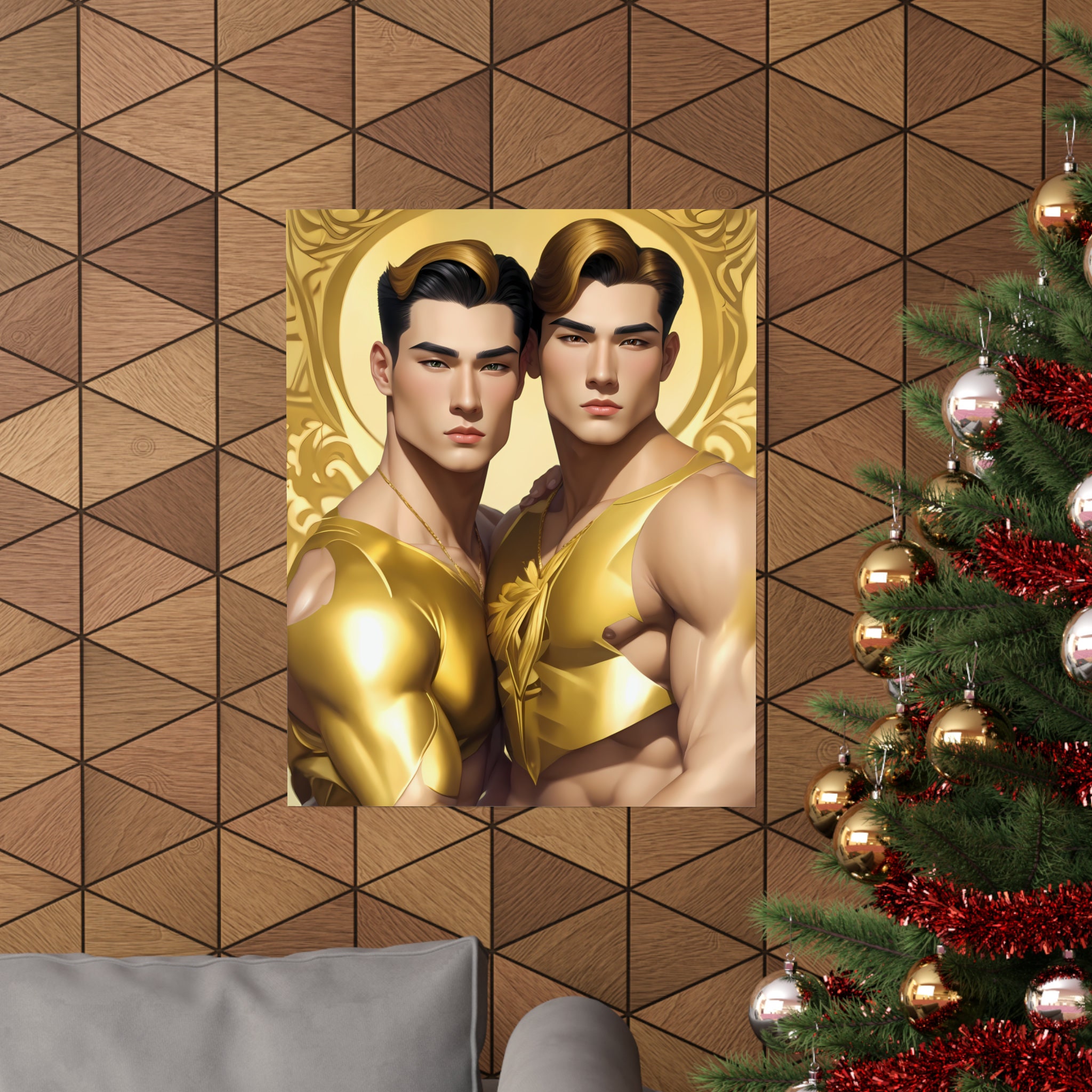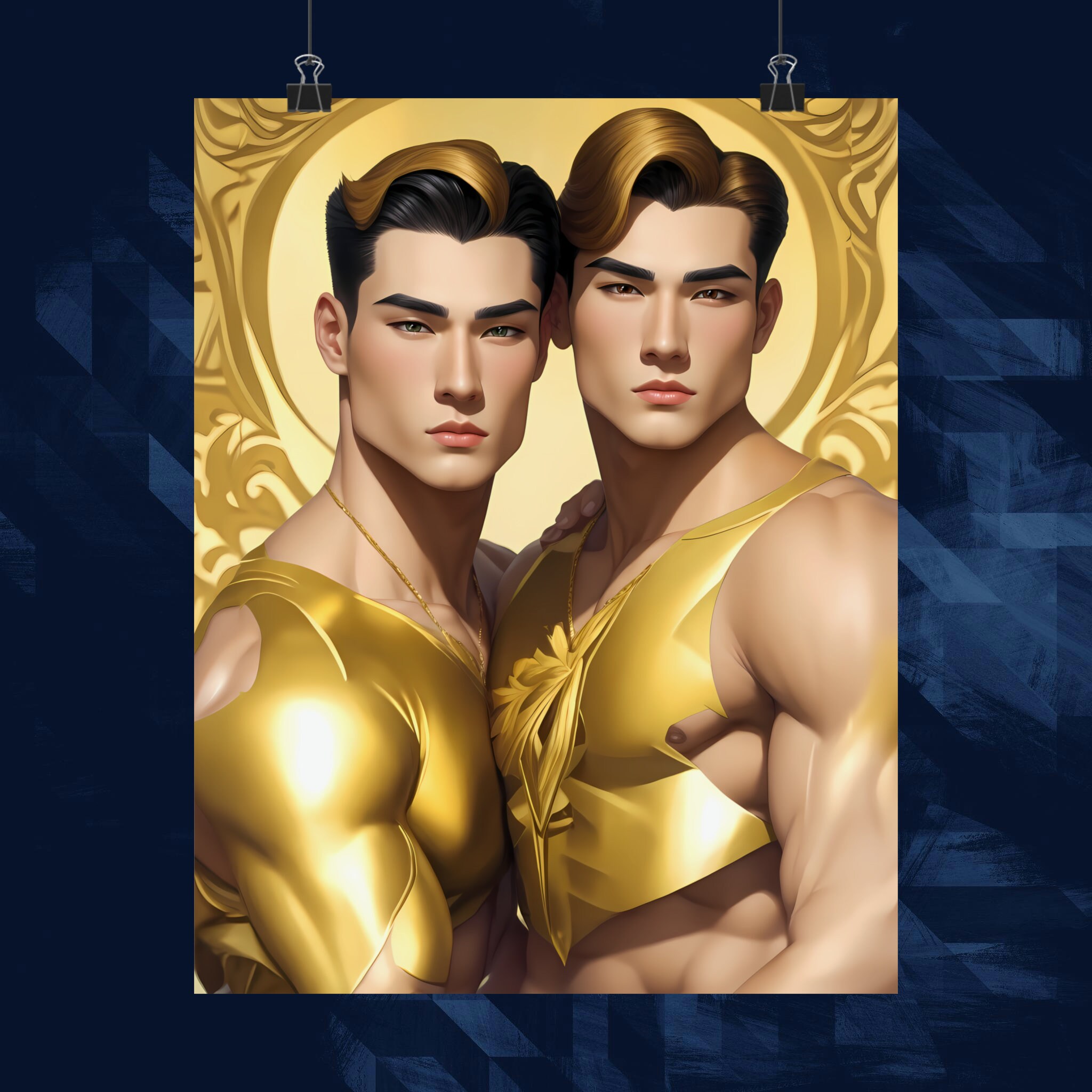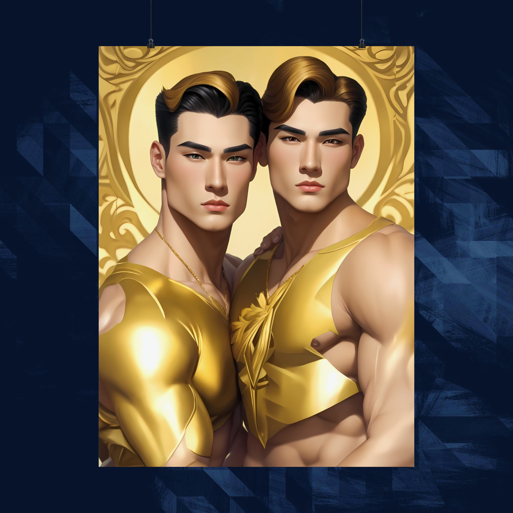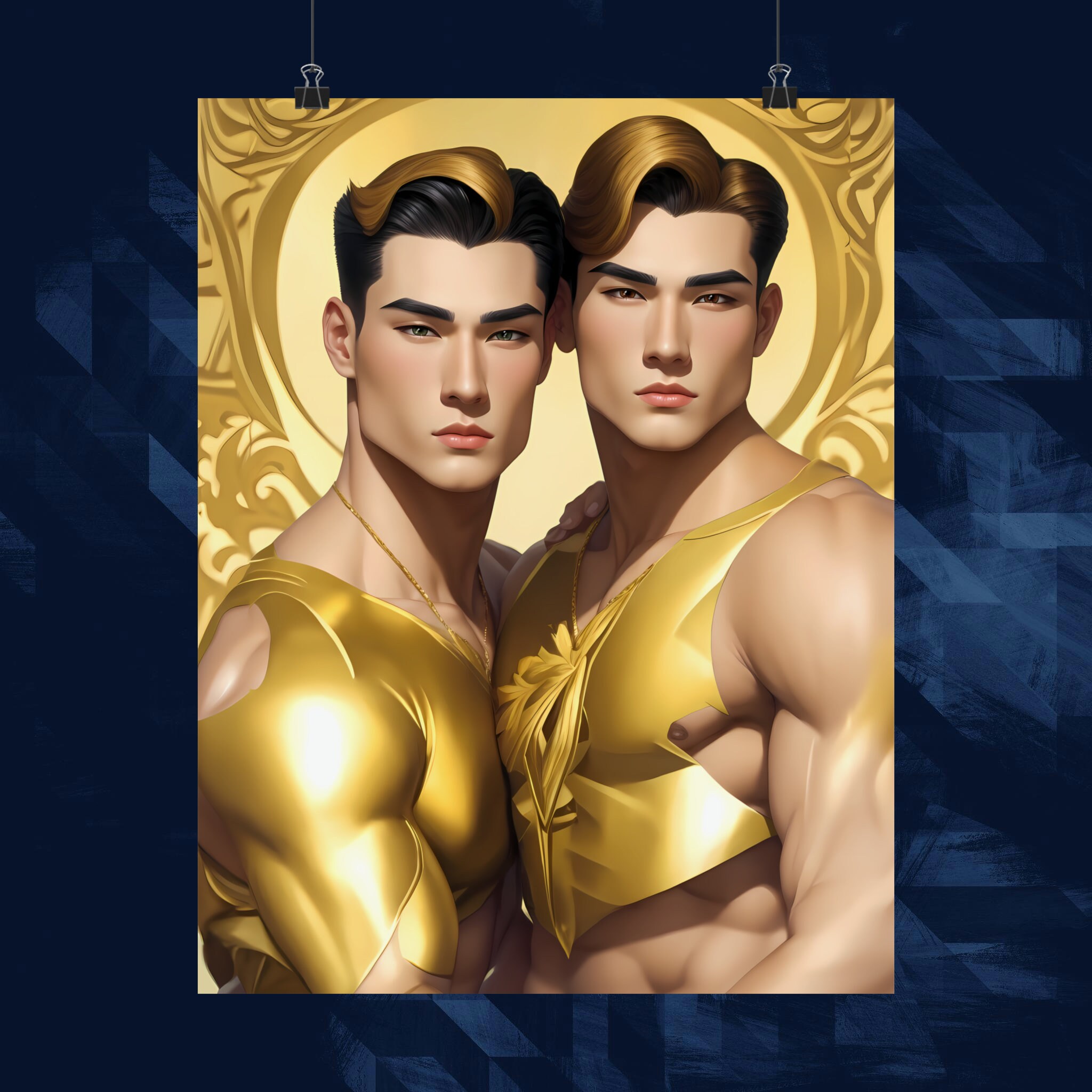 Elevate your space with our premium matte vertical posters showcasing a captivating Art Deco-style portrayal of a muscular and radiant gay couple. Crafted on museum-grade paper (175gsm fine art paper), these posters transform digital artwork into a masterpiece of real-life décor. The choice of top-tier pigmented archival inks ensures a stunning and enduring representation of this vibrant piece. Choose from multiple sizes to suit your space and indulge in the perfect fusion of artistic expression and premium quality.