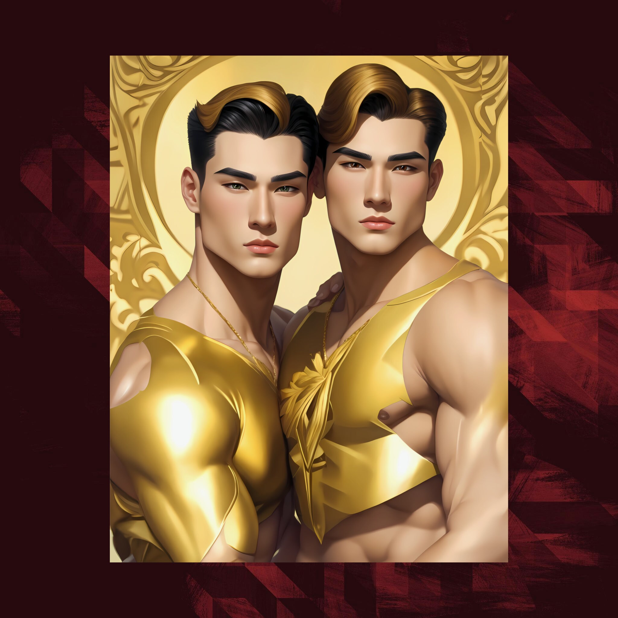 Matte Vertical Posters Art Deco Style Gay Male Couple Lempicka Inspired Fine Art Print Handsome Muscular Royal Asian Couple