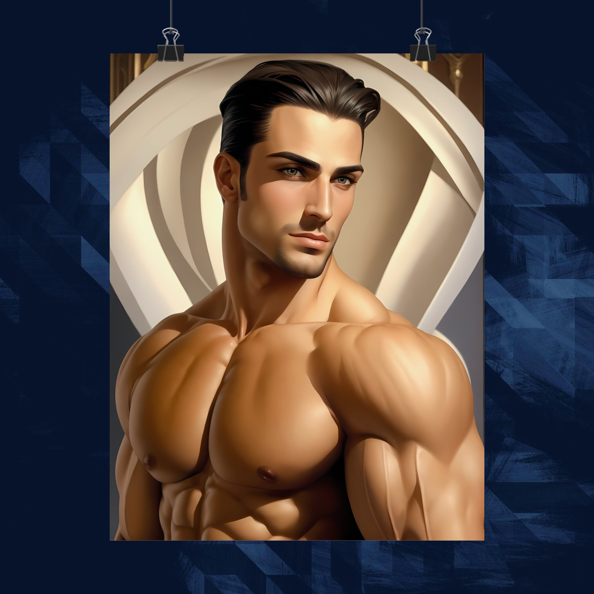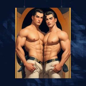Elevate your space with our premium matte vertical posters showcasing a captivating Art Deco-style portrayal of a muscular and radiant gay couple. Crafted on museum-grade paper (175gsm fine art paper), these posters transform digital artwork into a masterpiece of real-life décor. The choice of top-tier pigmented archival inks ensures a stunning and enduring representation of this vibrant piece. Choose from multiple sizes to suit your space and indulge in the perfect fusion of artistic expression and premium quality.