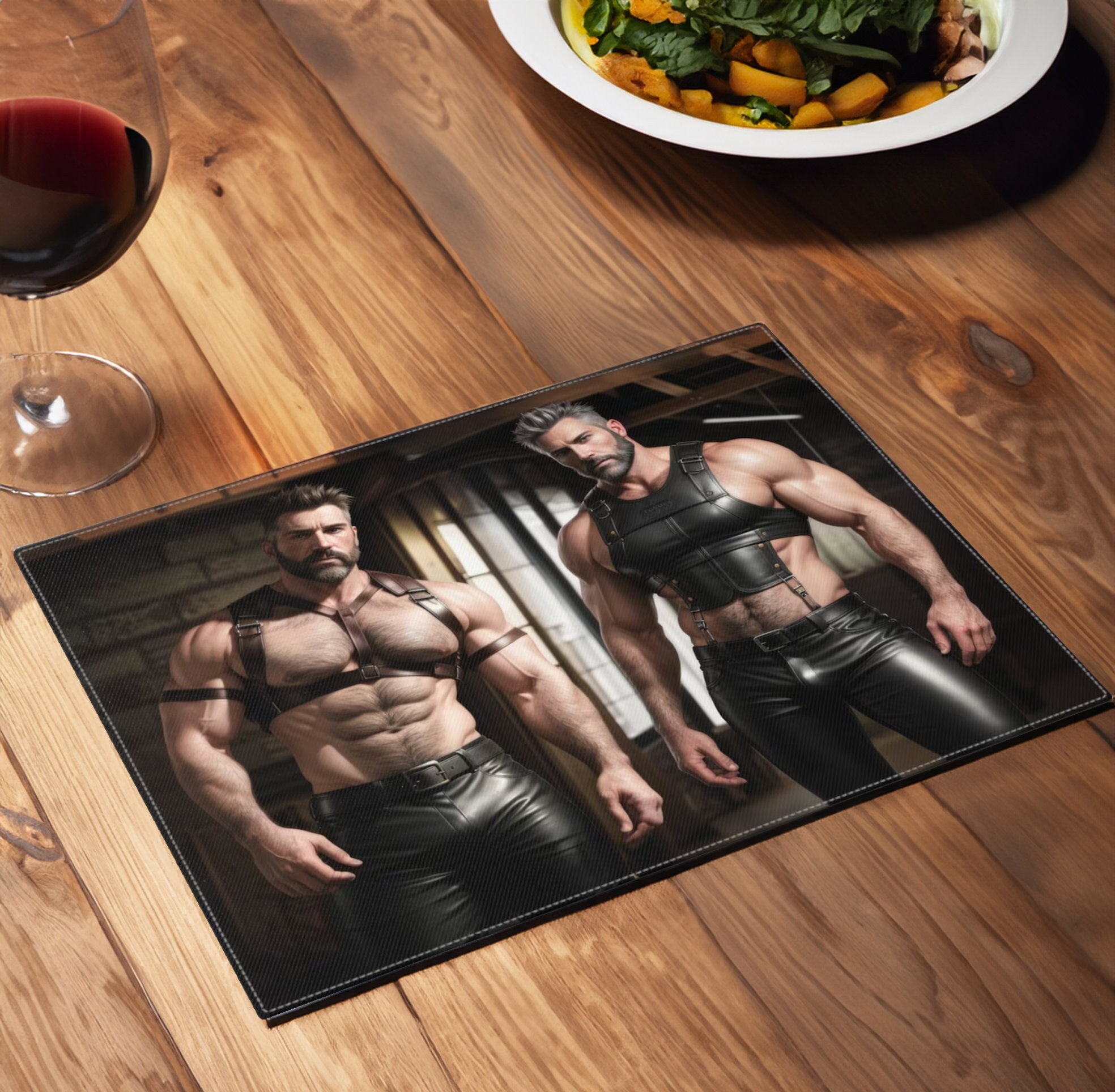 Spice up your dining experience with our sizzling lineup of tabletop placemats featuring irresistibly handsome, muscular leather-clad men! Add a touch of allure and excitement to every meal as you dine amidst these captivating designs.