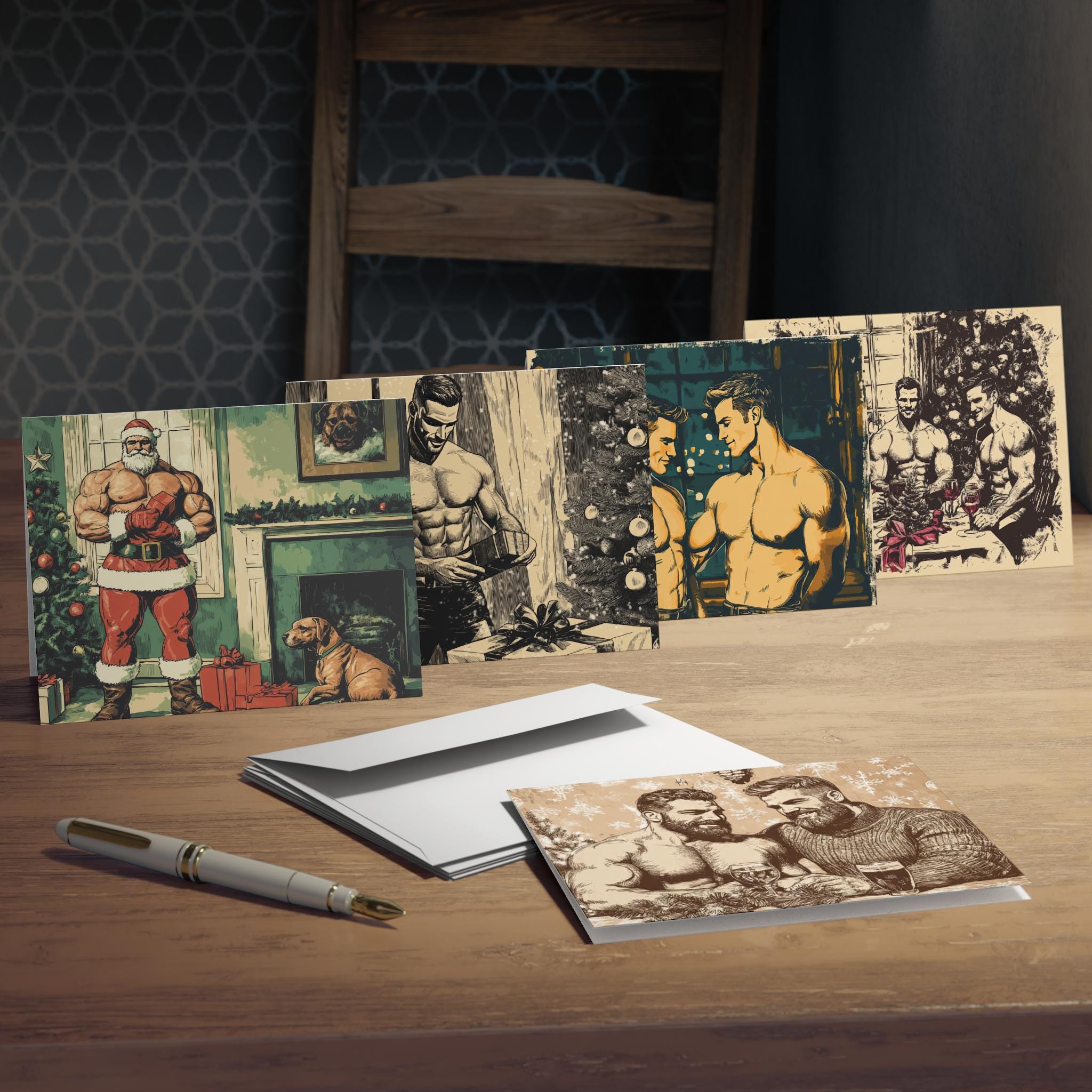 Spread the love and nostalgia this festive season with our sizzling collection of Retro Vintage Gay Christmas Greeting Cards. The cards feature impeccably handsome and rugged men, embodying the charm of yesteryear. Perfect for Christmas surprises for loved ones, these cards are available in a vertical format, reminiscent of the timeless aesthetic of the past. Whether you need just one for that special someone or a bundle of 5 for all your friends, we've got you covered with our carefully curated selection. Each card comes with an envelope, effortlessly preserving the vintage charm and ensuring your holiday greetings are delivered in style. Relevant for Christmas, holidays, and celebrations.
