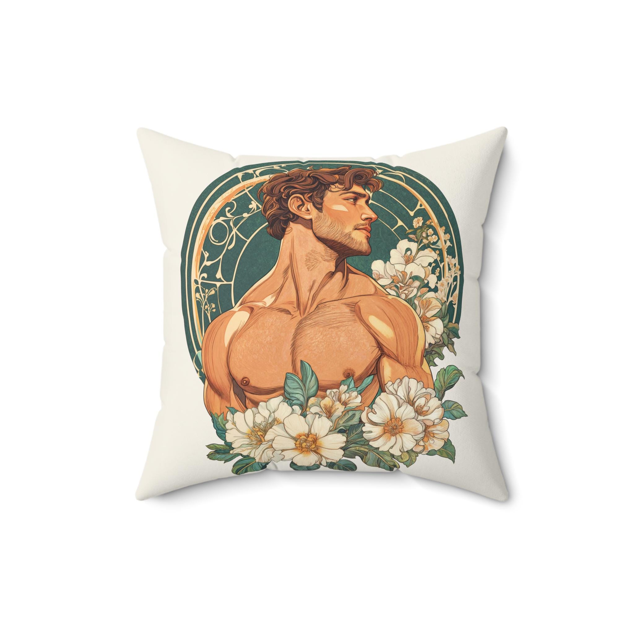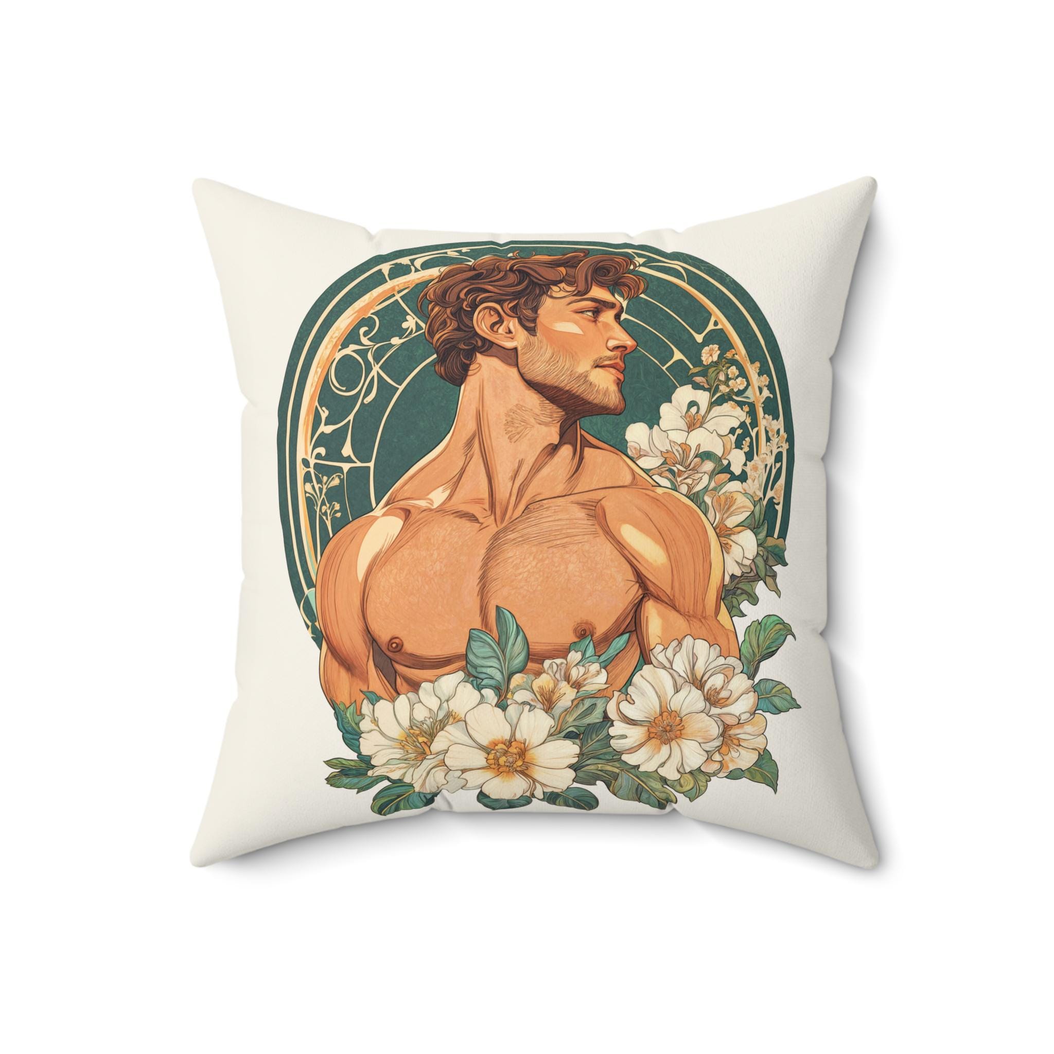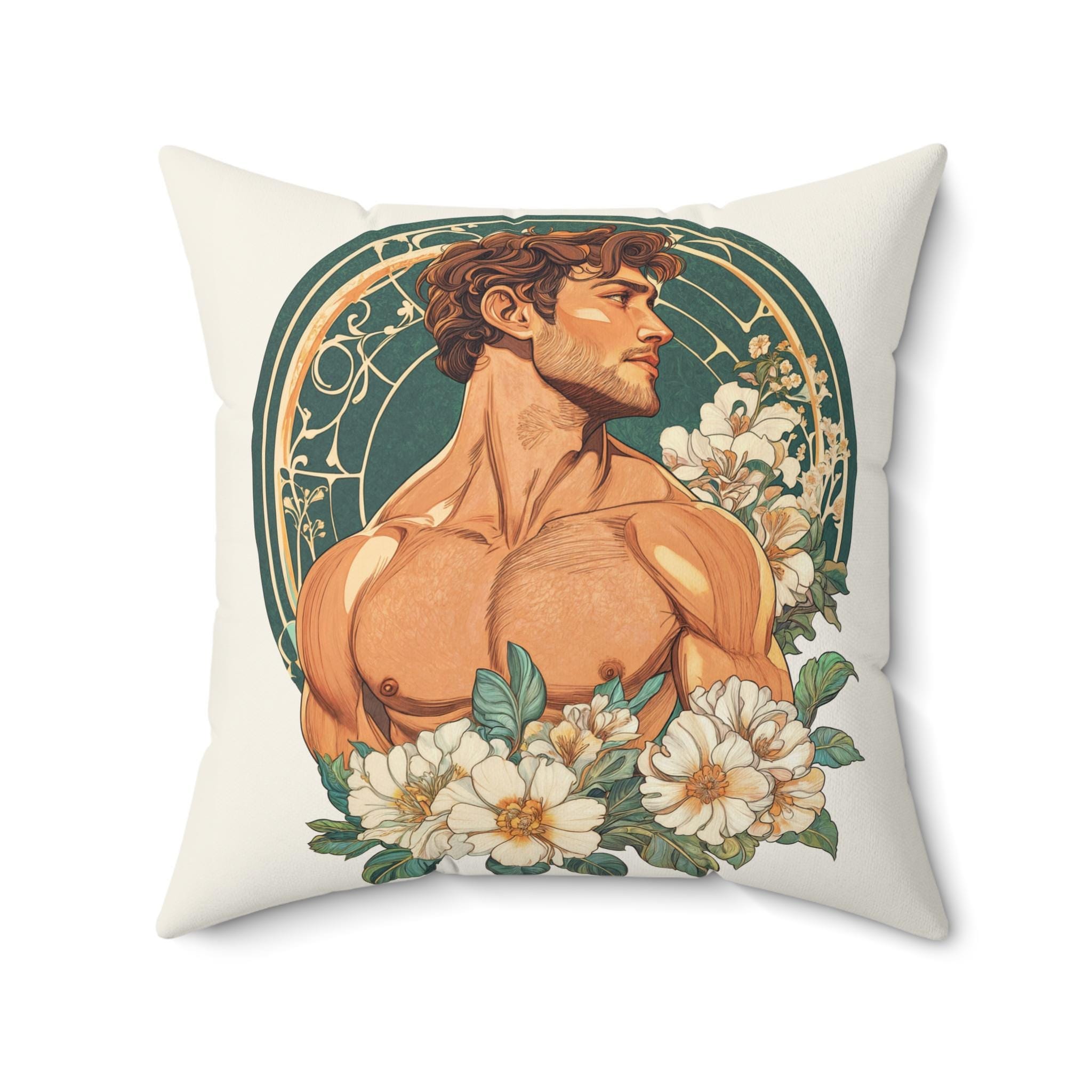 This Spun Polyester Square Pillow features an Art Deco Gay Theme with a Muscular Male surrounded by flowers, giving off a trendy and artistic vibe. Perfect for adding a pop of color and personality to any living room or bedroom. Ideal for those who appreciate unique and LGBTQ+ inclusive decor. Relevant for Pride Month, LGBTQ+ celebrations, and Art Deco enthusiasts.