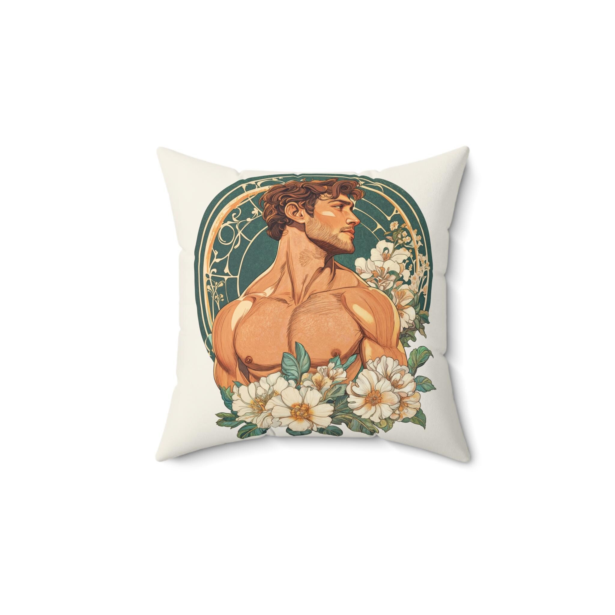 Art Deco Gay Theme Pillow, Gay Home Decor, LGBT Pride Home Decor, Muscular Male with Flowers, Throw Cushion, Unique Accent Pillow, Gay Gift