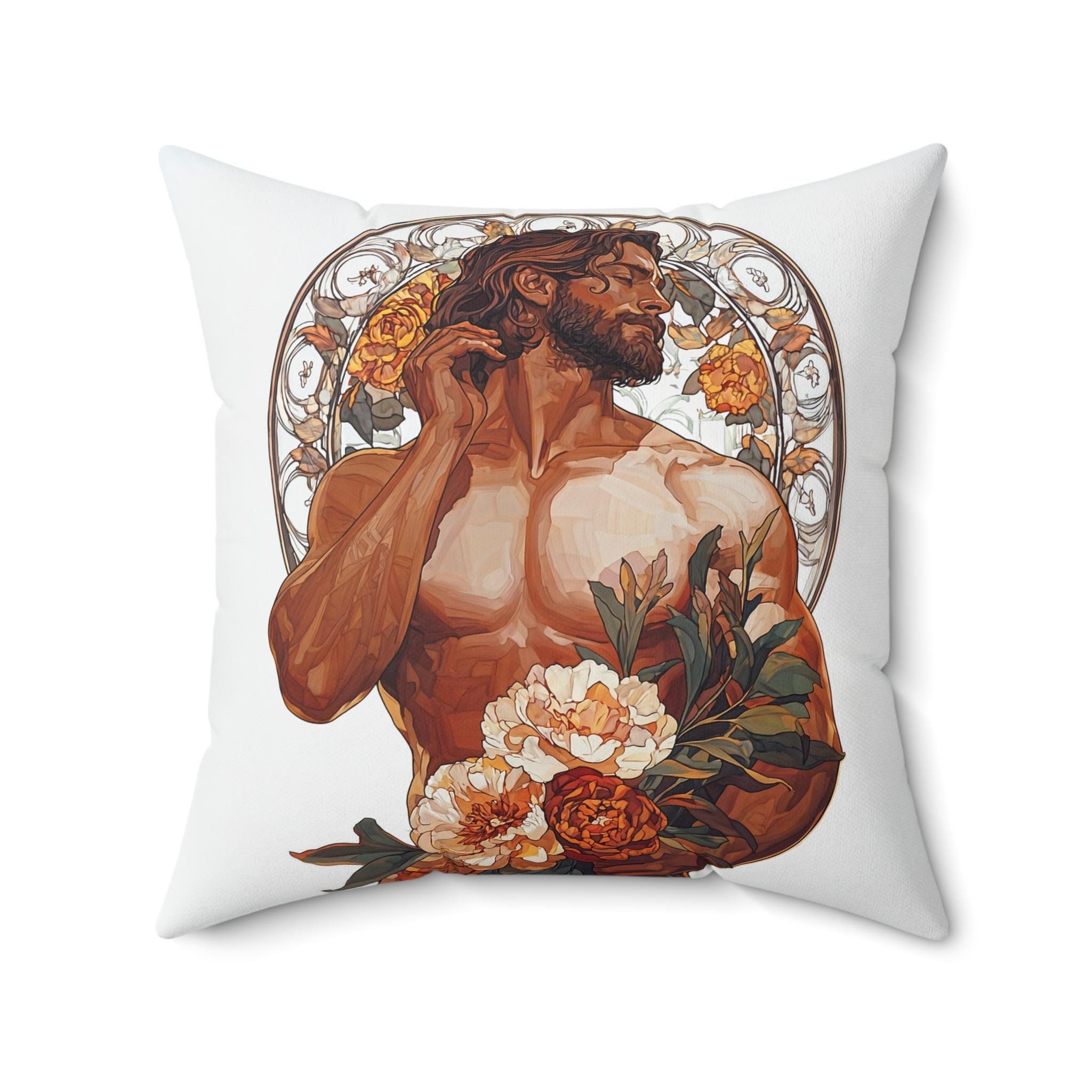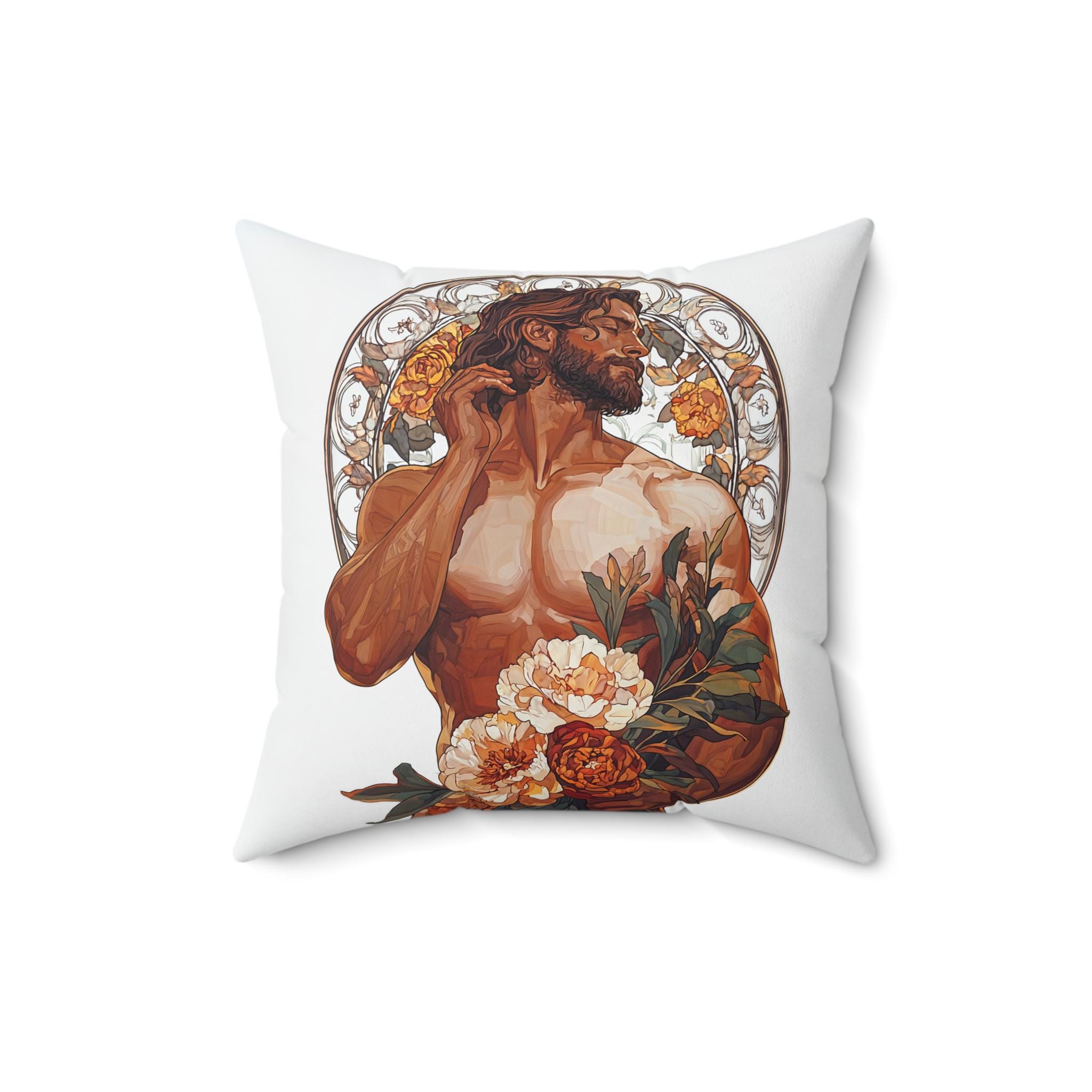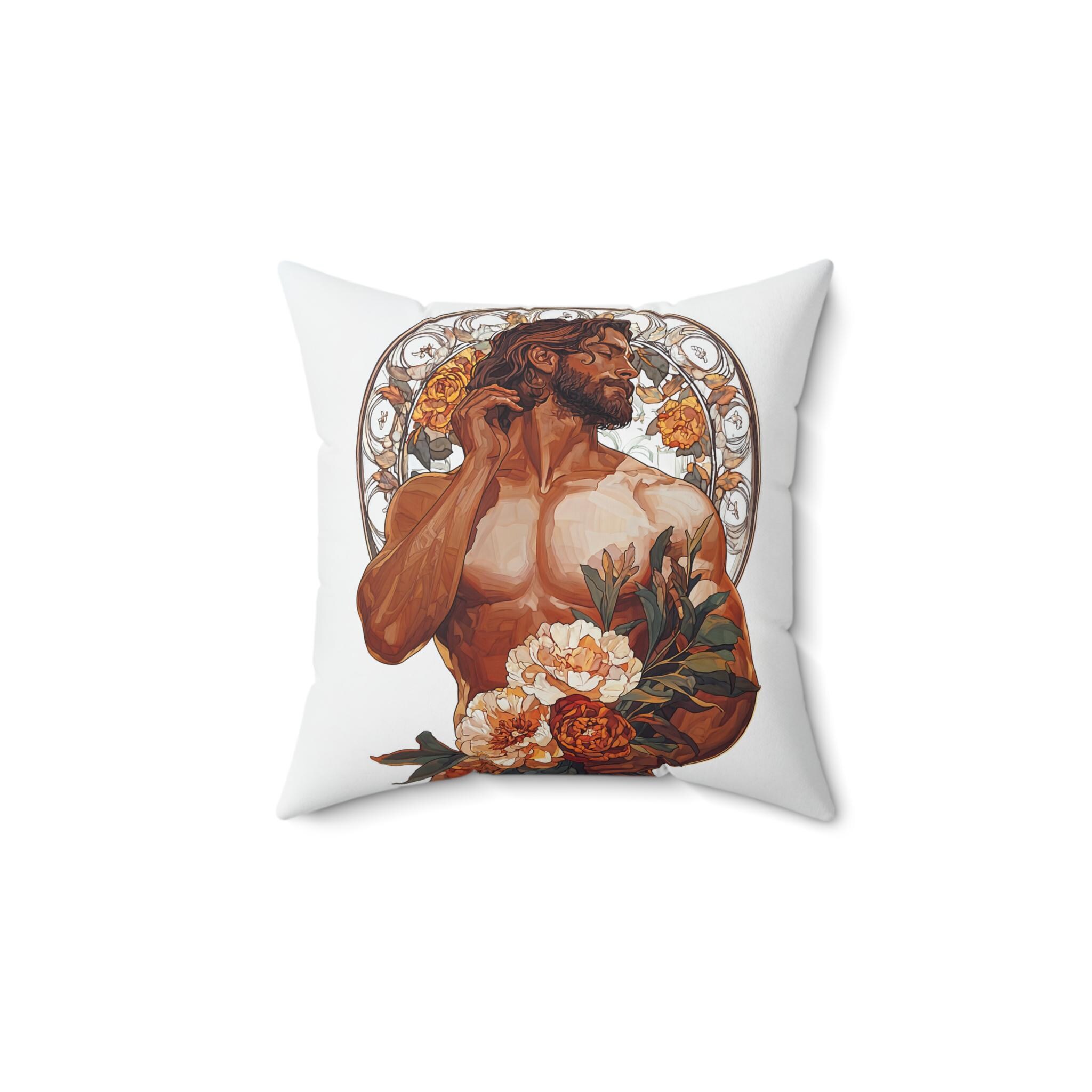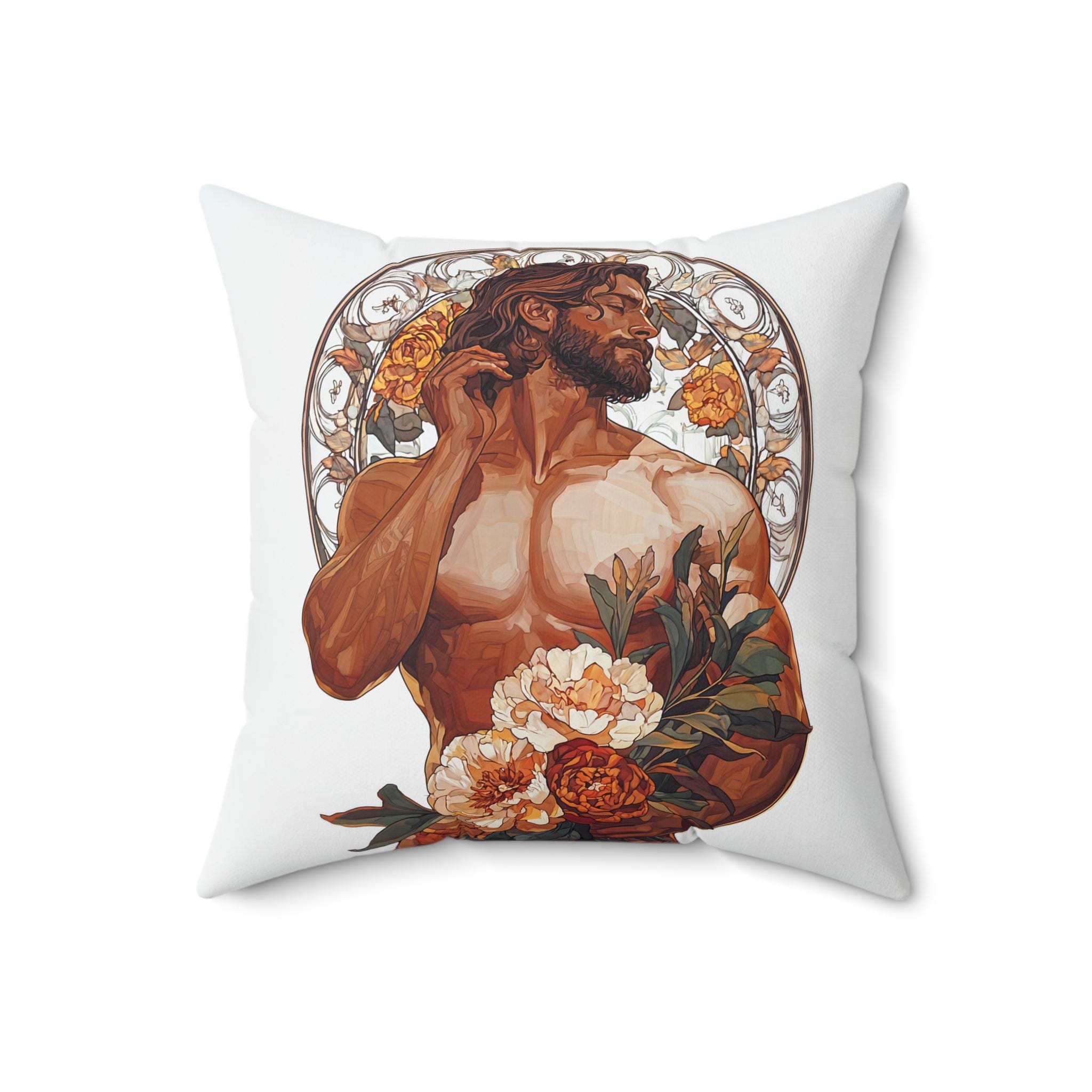 This Spun Polyester Square Pillow features an Art Deco Gay Theme with a Muscular Male surrounded by flowers, giving off a trendy and artistic vibe. Perfect for adding a pop of color and personality to any living room or bedroom. Ideal for those who appreciate unique and Gay and Queer decor. Relevant for Pride Month, LGBTQ+ celebrations, and Art Deco enthusiasts.
