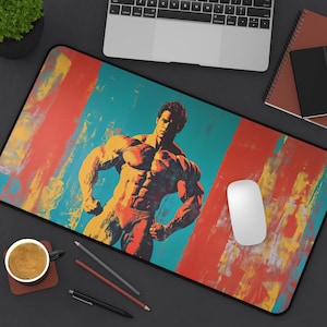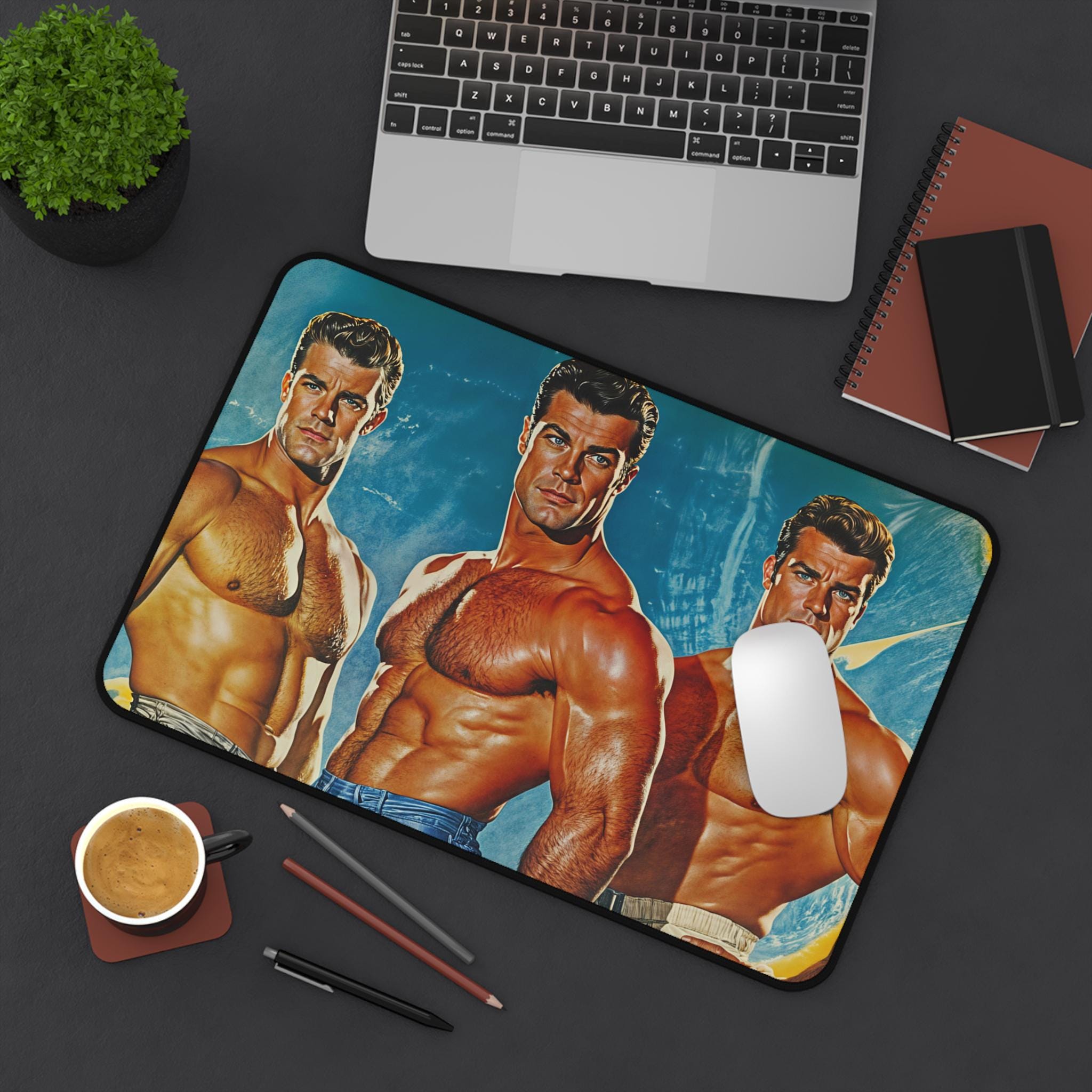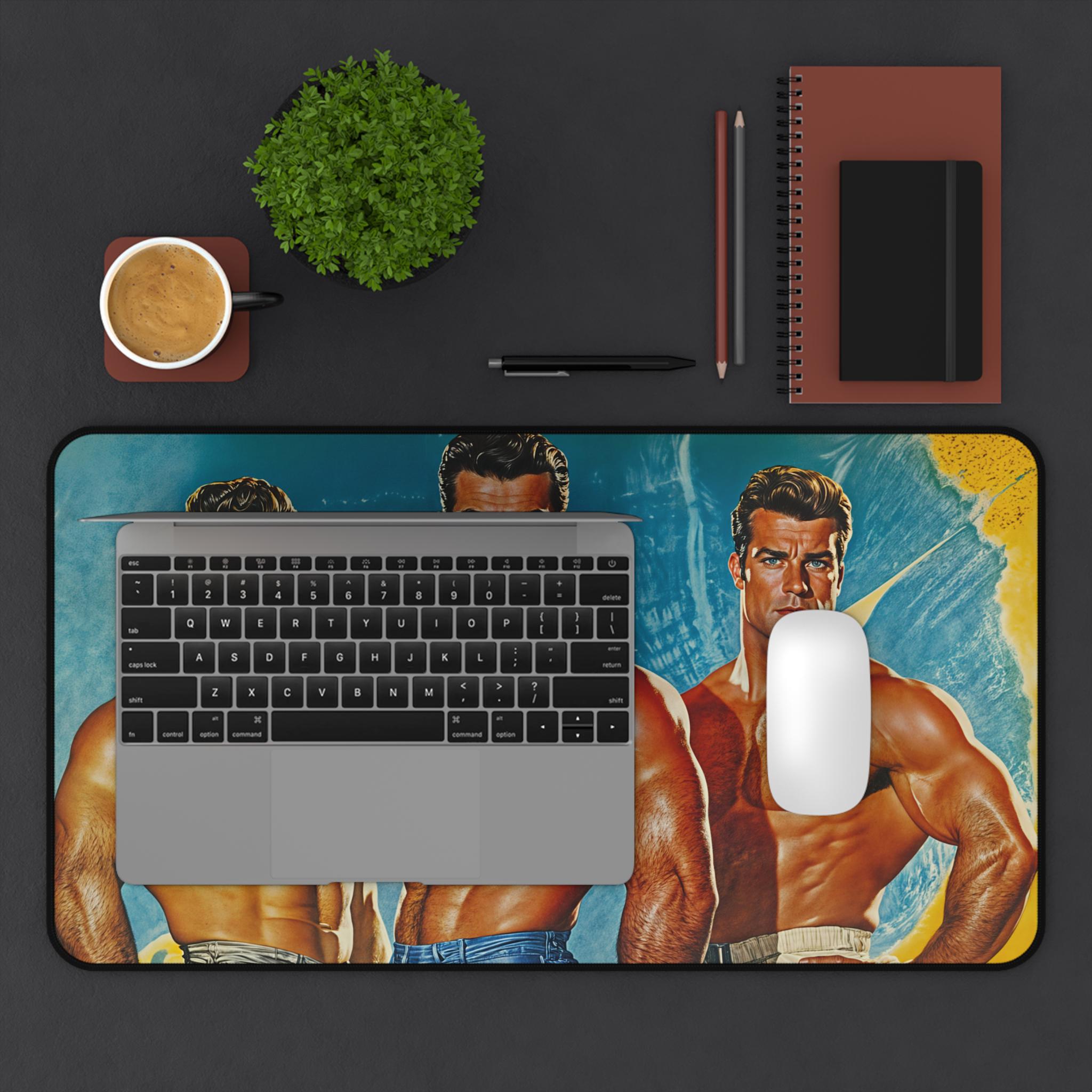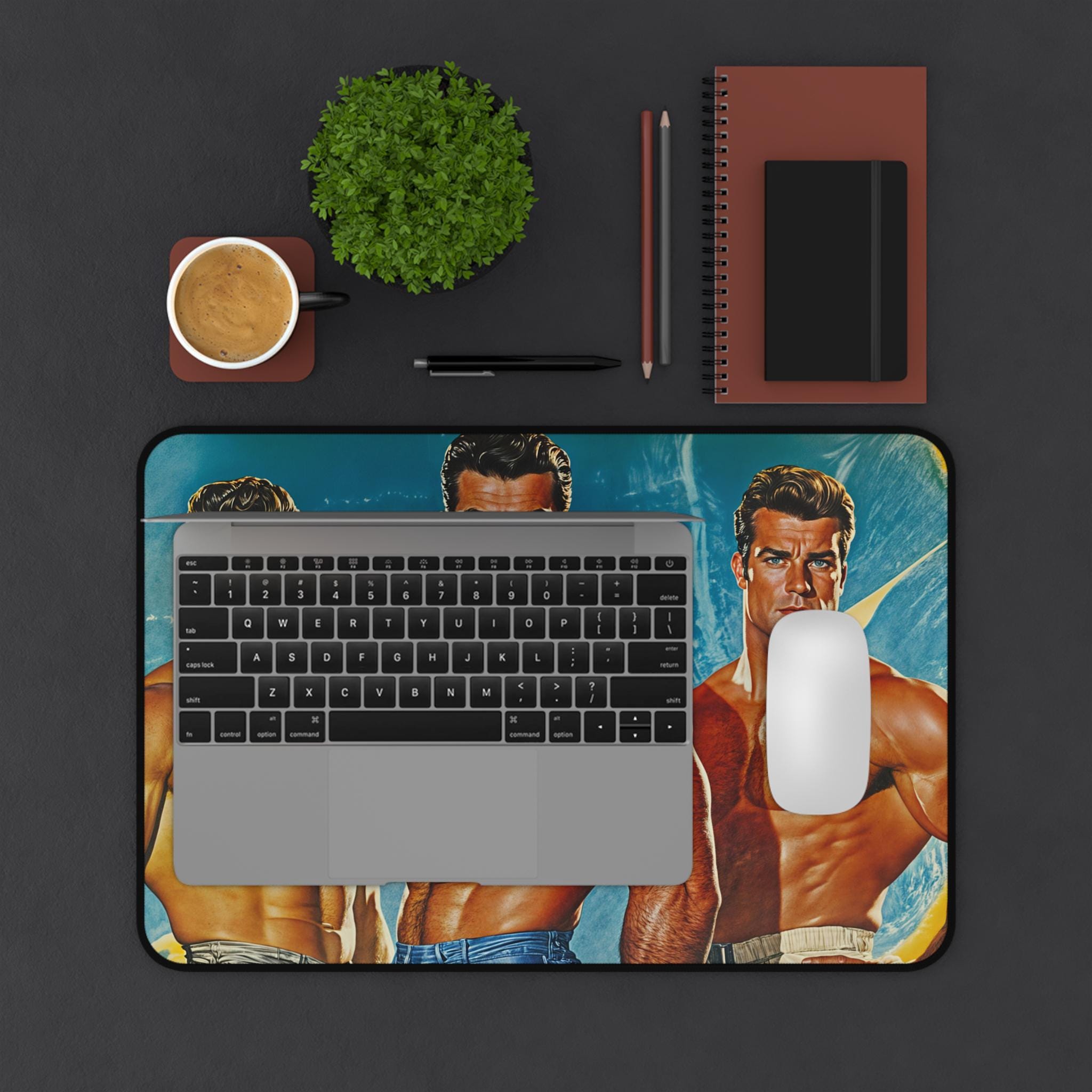This Desk Mat features vibrant colors and technicolor retro art, perfect for fans of gay actors. The non-slip bottom ensures it stays in place while providing a supportive surface for writing, typing, or crafting. This desk mat is relevant for those looking to add a pop of color and style to their workspace or as a fun gift for fans of retro art.
