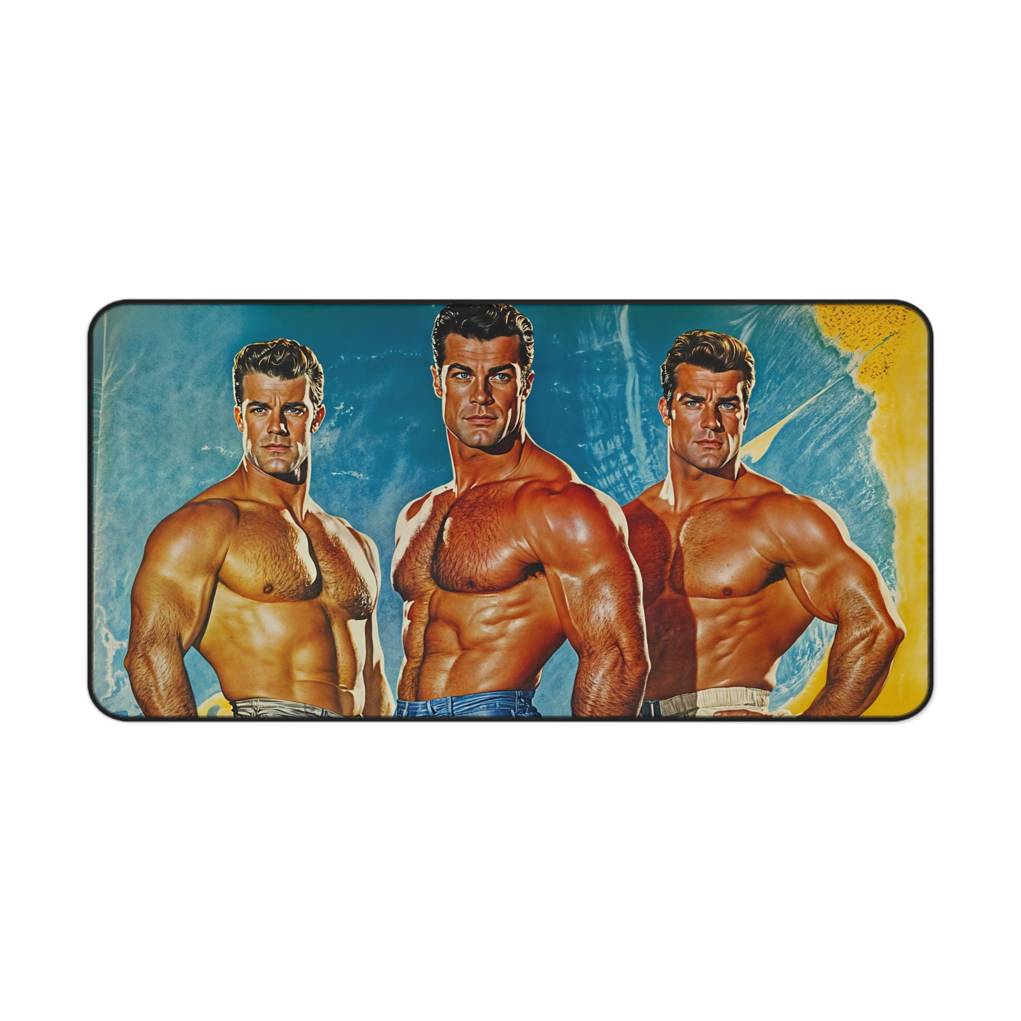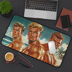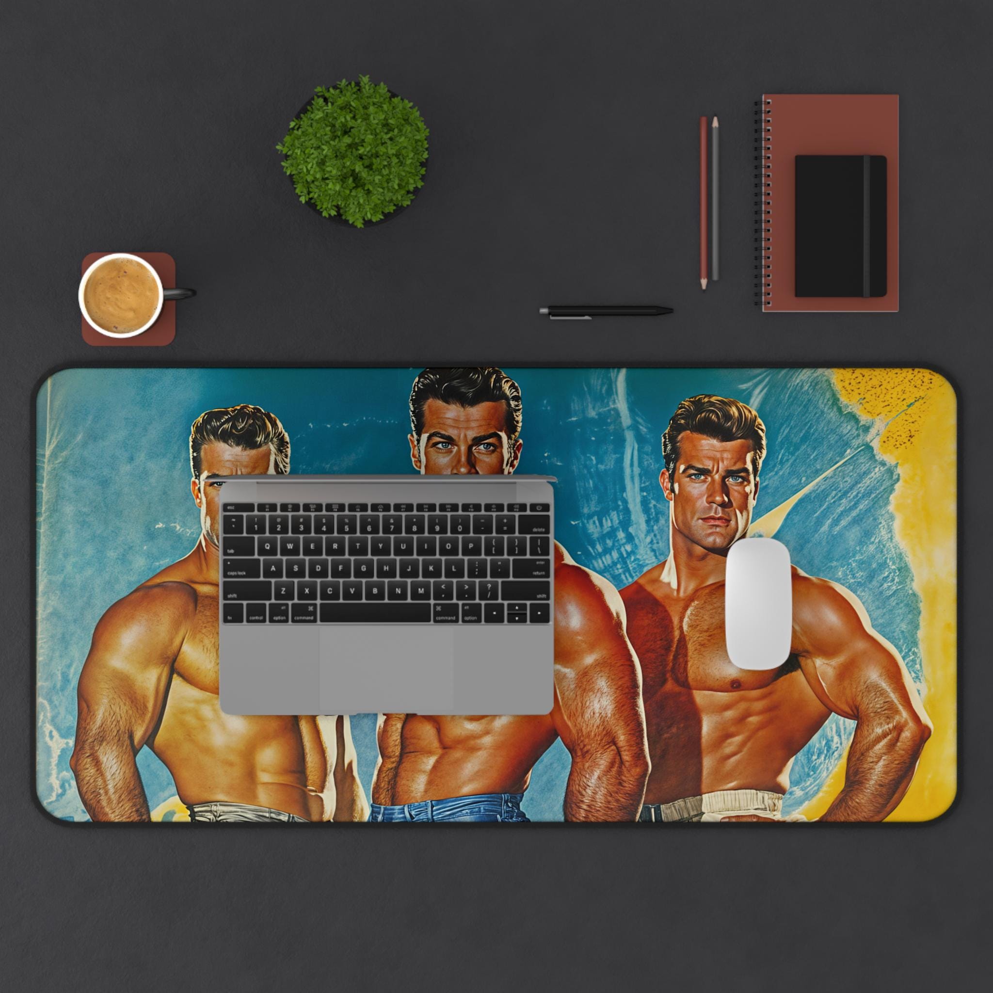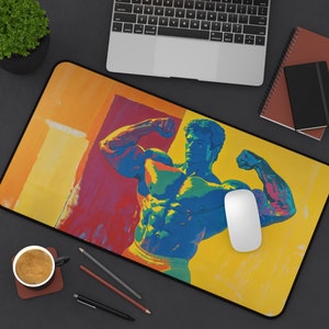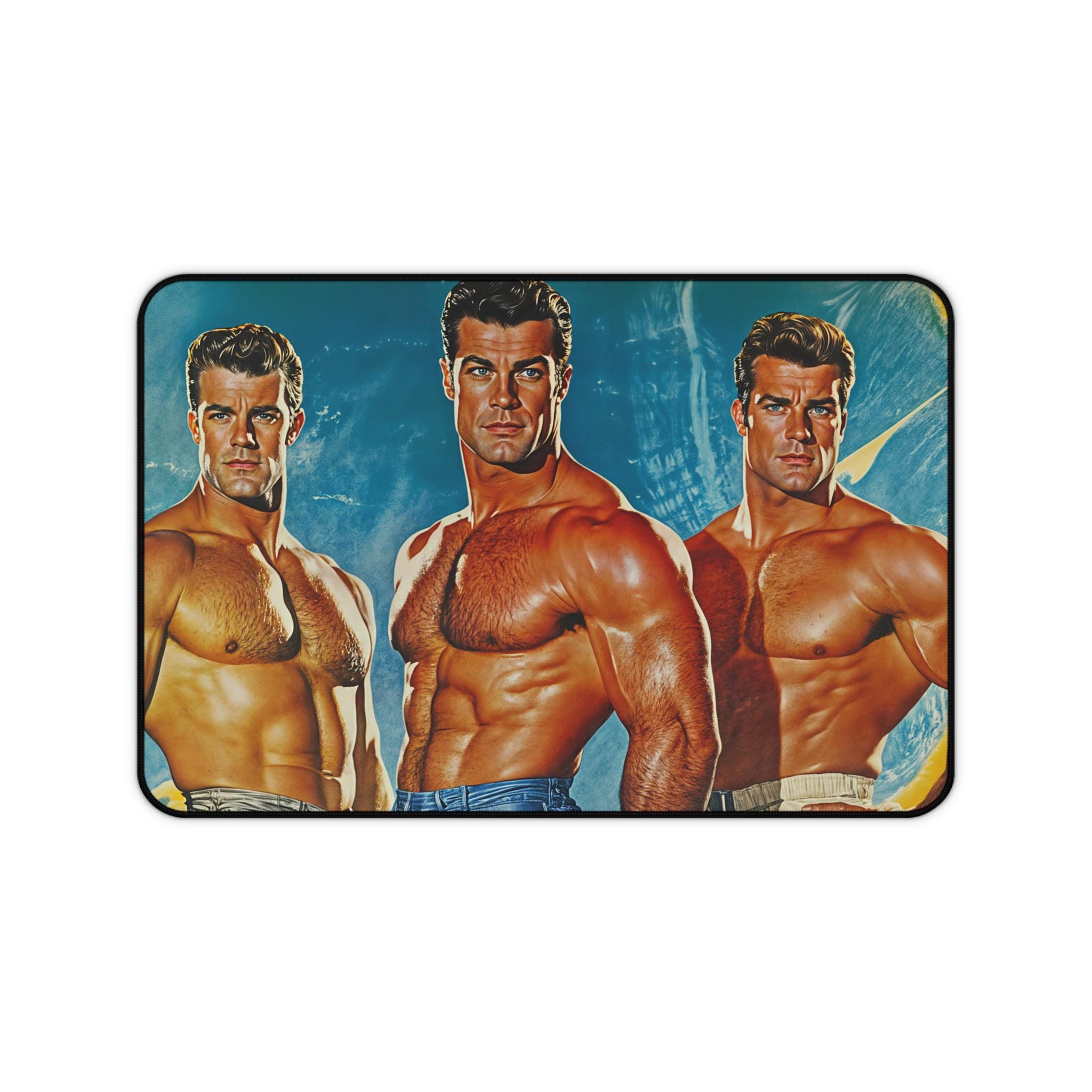 This Desk Mat features vibrant colors and technicolor retro art, perfect for fans of gay actors. The non-slip bottom ensures it stays in place while providing a supportive surface for writing, typing, or crafting. This desk mat is relevant for those looking to add a pop of color and style to their workspace or as a fun gift for fans of retro art.