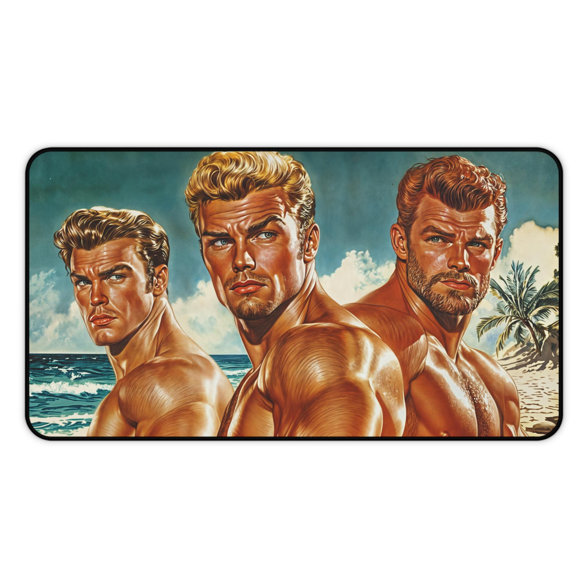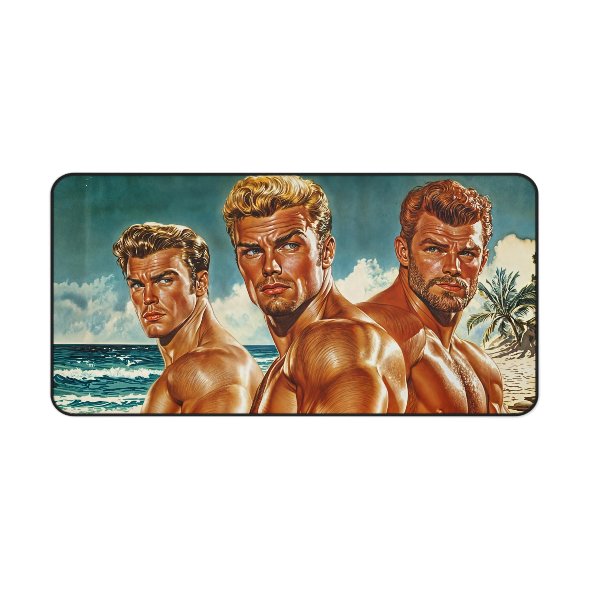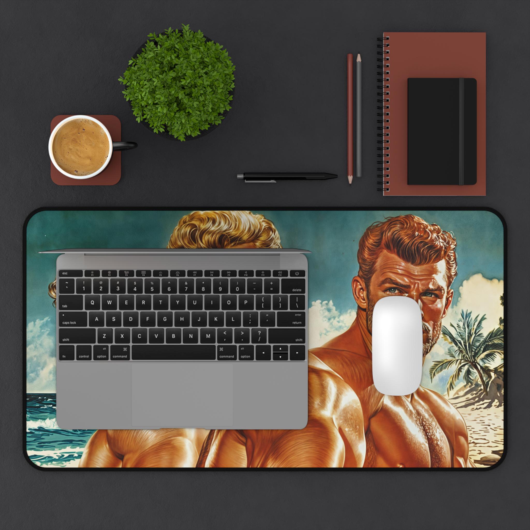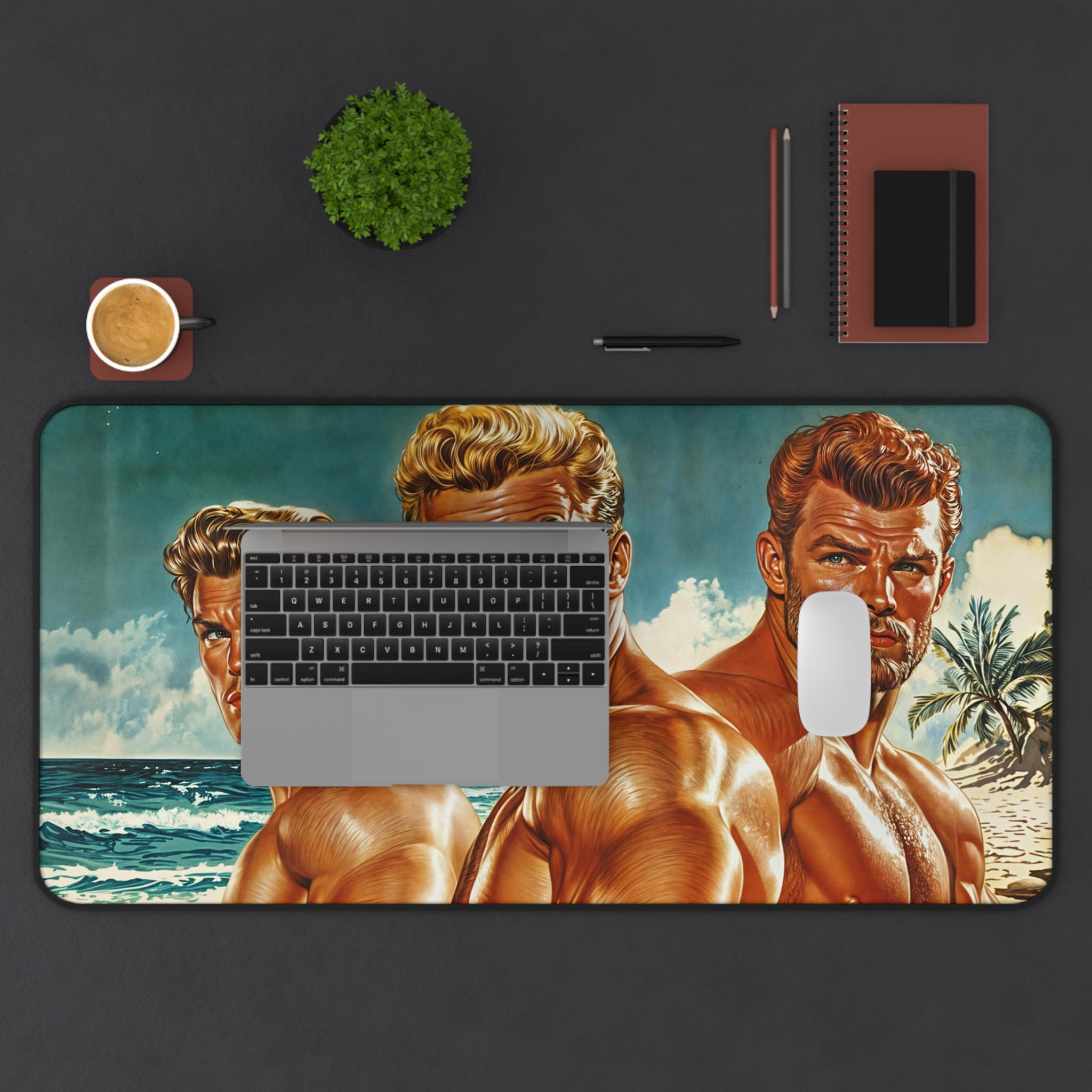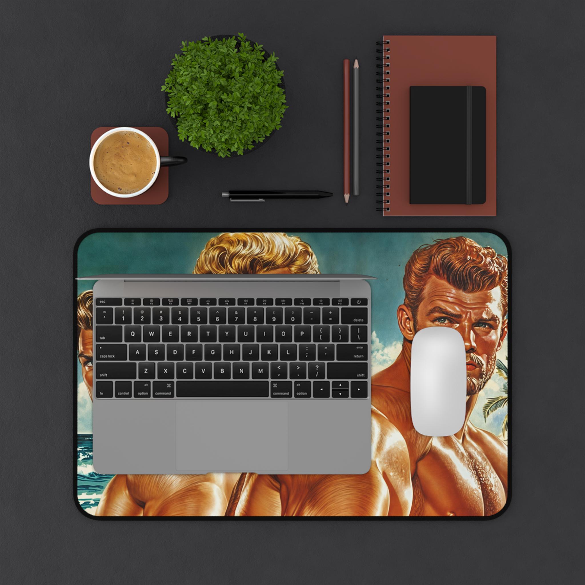 This Desk Mat features vibrant colors and technicolor retro art, perfect for fans of gay actors. The non-slip bottom ensures it stays in place while providing a supportive surface for writing, typing, or crafting. This desk mat is relevant for those looking to add a pop of color and style to their workspace or as a fun gift for fans of retro art.