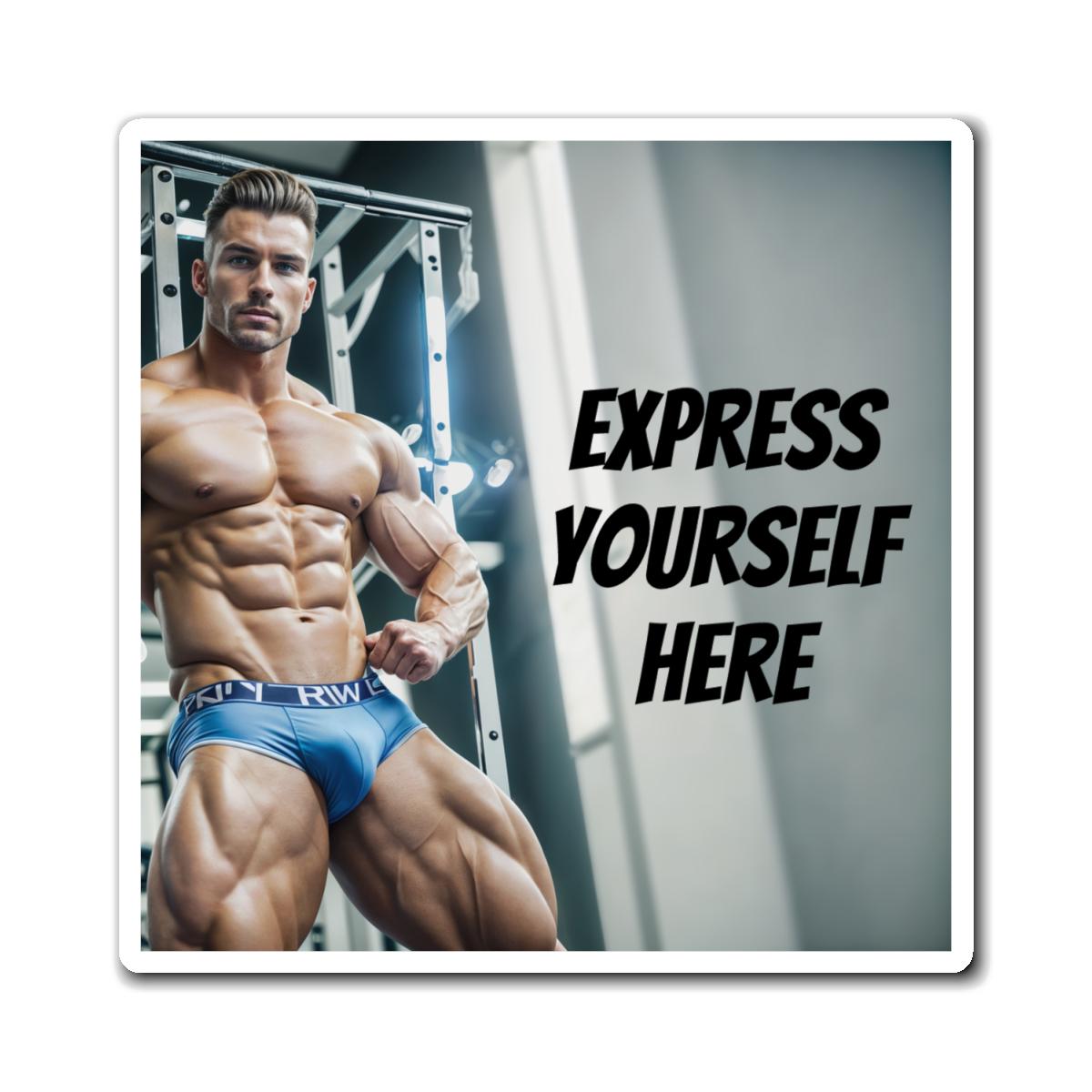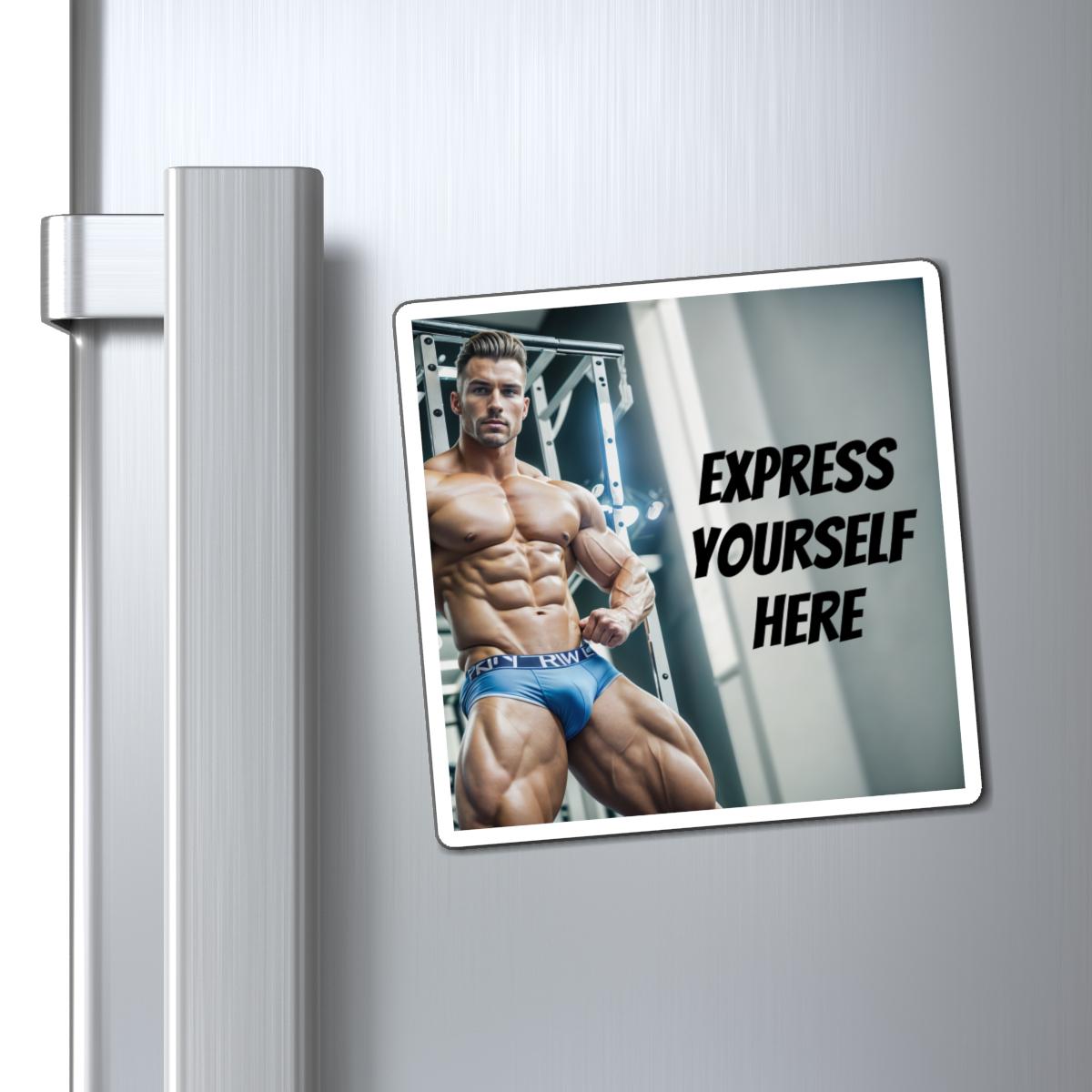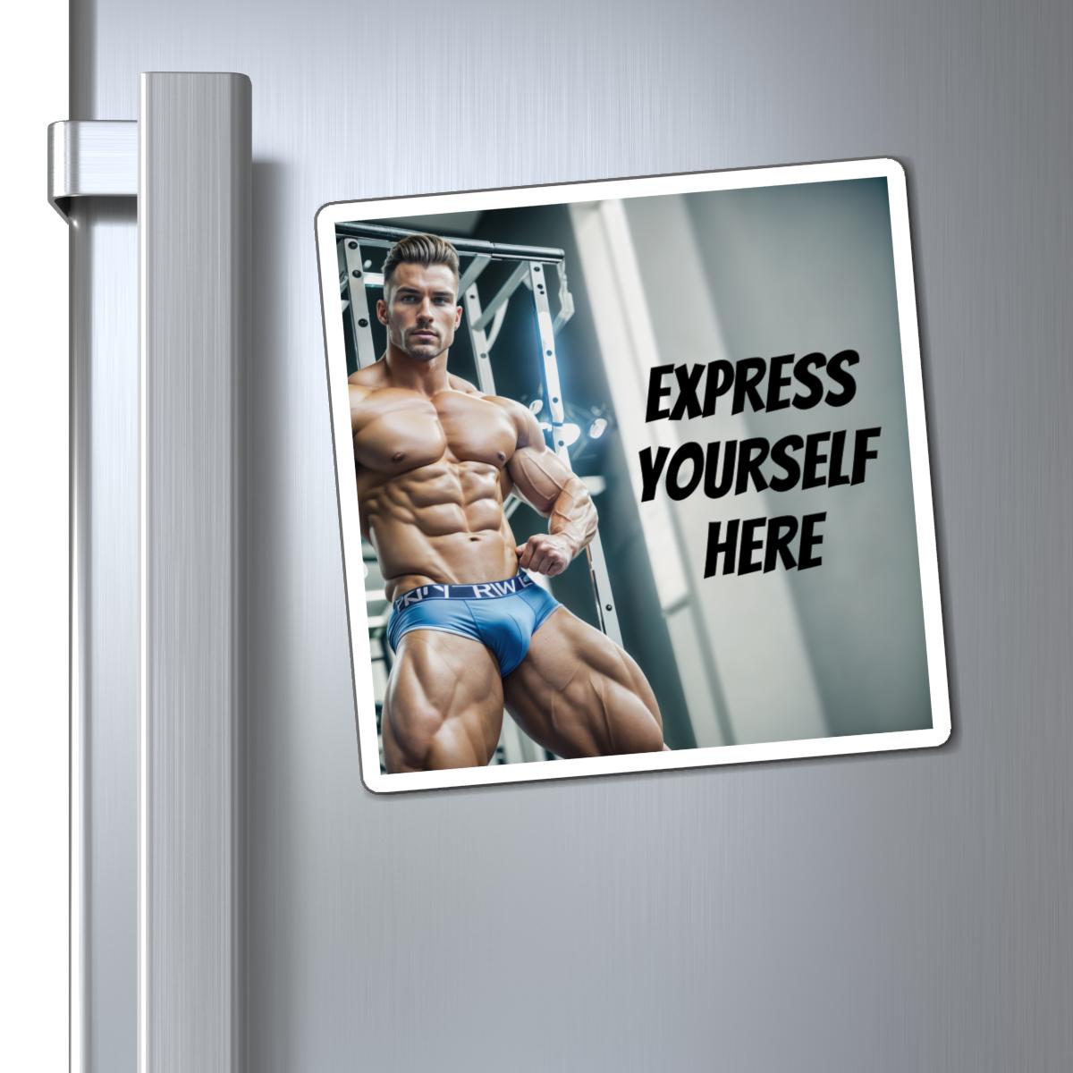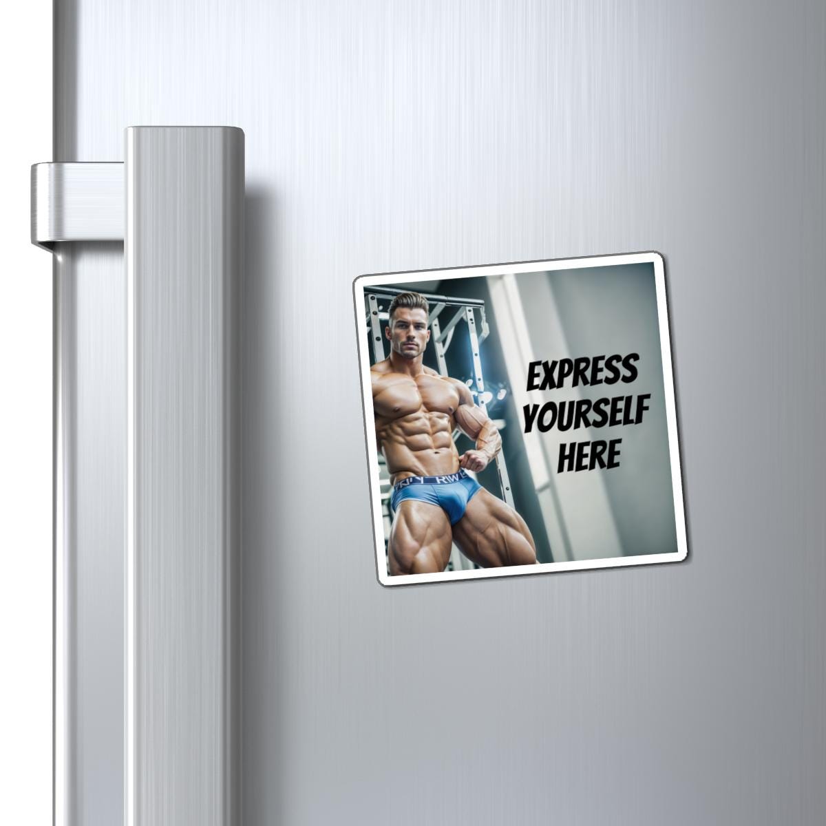 This square magnet features a custom text design of a muscular fitness dude bodybuilder. It exudes a sexy and vintage vibe, perfect for anyone who loves AI fantasy art. This magnet is customizable with text, making it a unique and personality-filled addition to any space. Ideal for fitness enthusiasts, bodybuilding fans, and lovers of vintage pin-up art. Great for decorating cars, refrigerators, and more, this magnet is a fun and eye-catching accessory for any occasion.