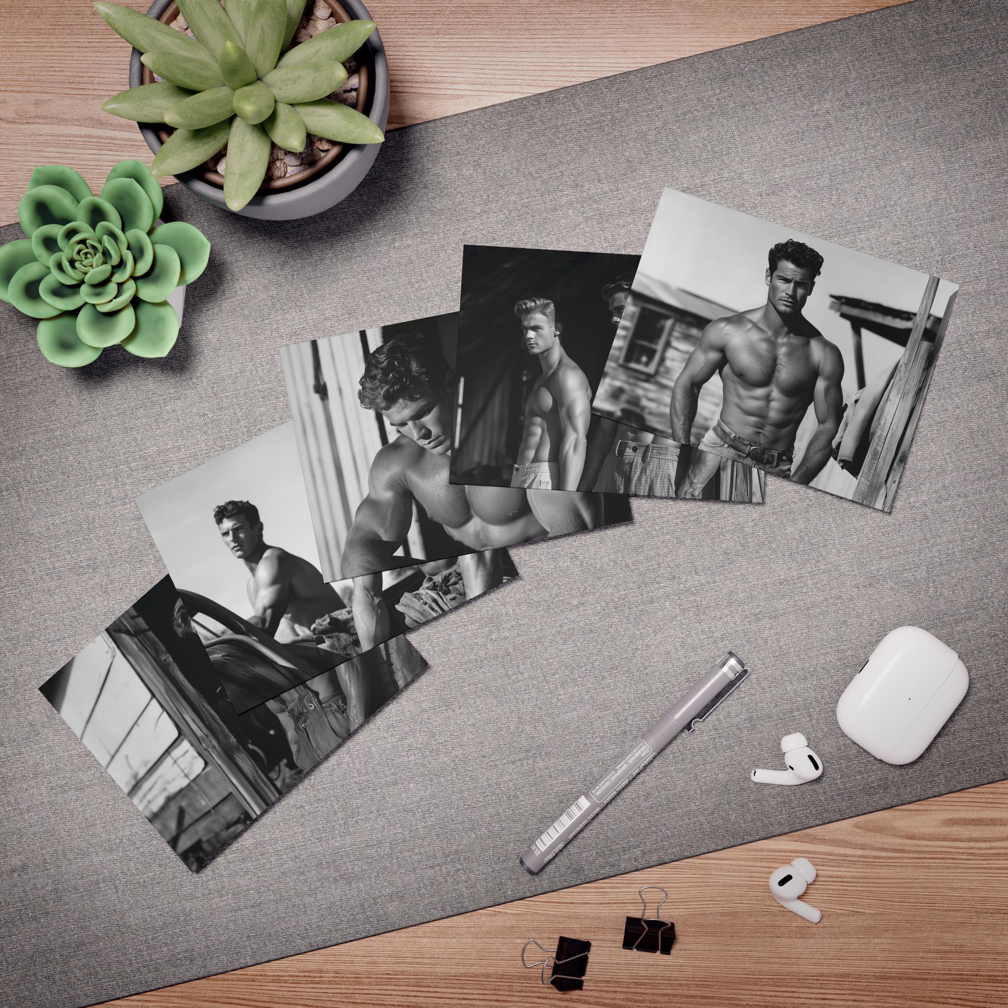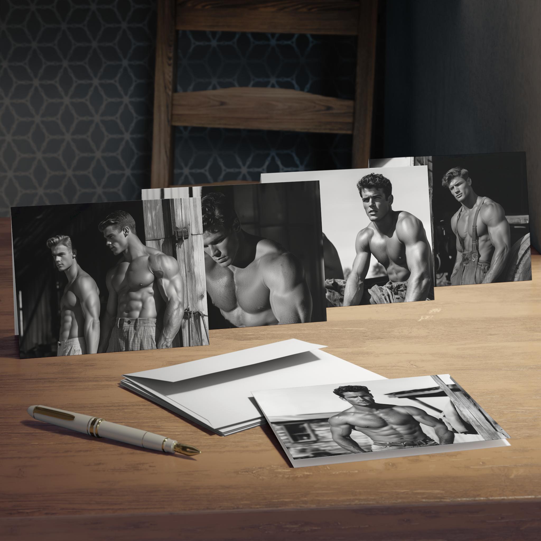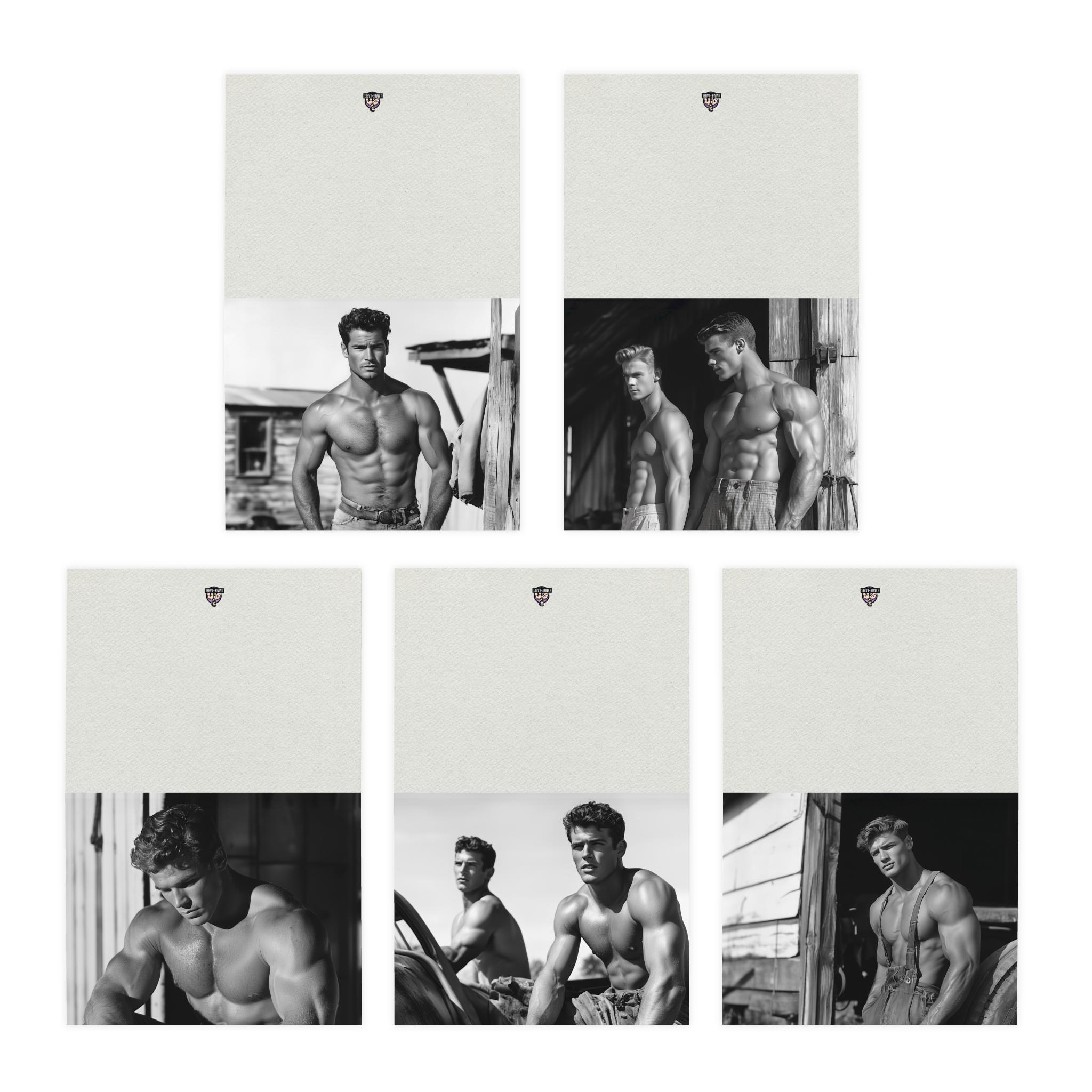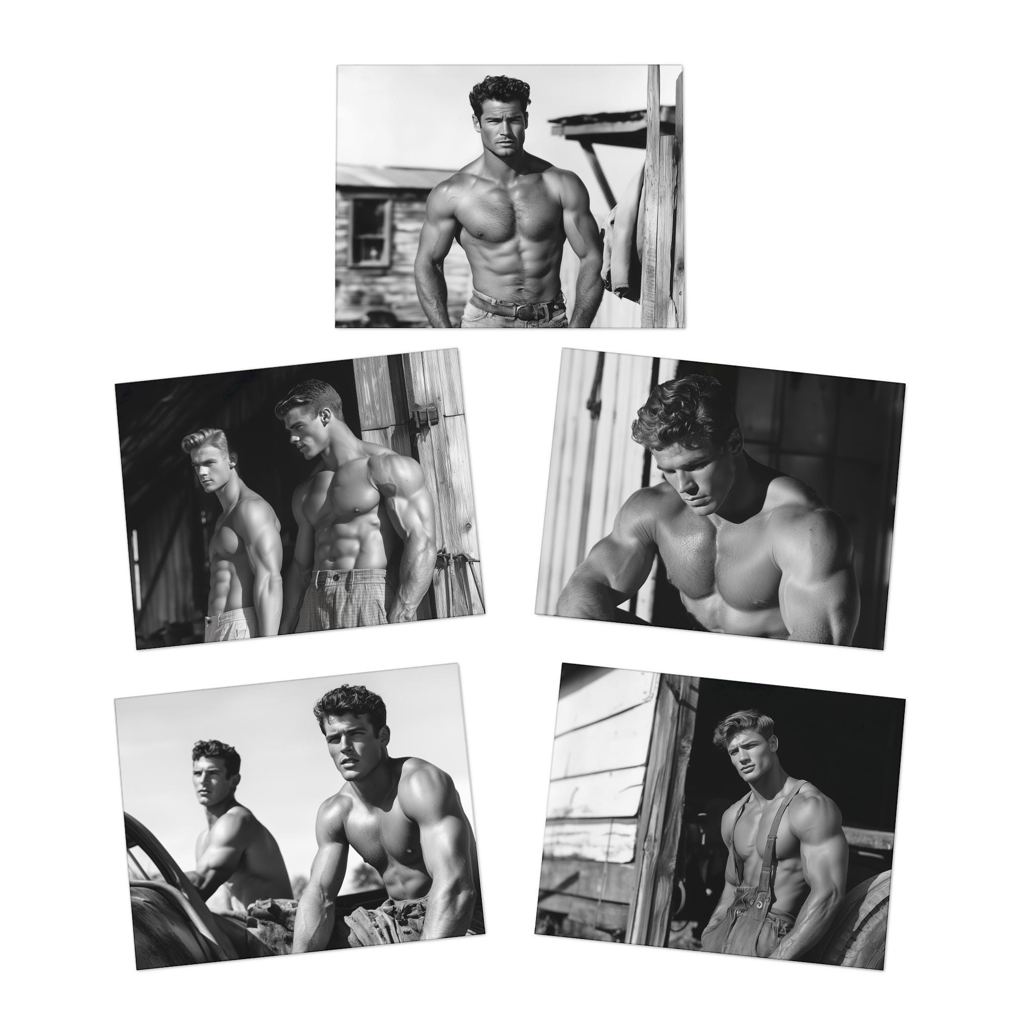 Vintage Muscular Hunks Gay Postcards (5-Pack) featuring Handsome Farm Boys designs. Perfect for all occasions, this multi-design pack of greeting cards adds a unique and fun touch to your correspondence. Relevant to LGBTQ+ community members, fans of vintage aesthetics, and those who appreciate playful and nostalgic designs. Ideal for birthdays, holidays, thank you notes, and more.