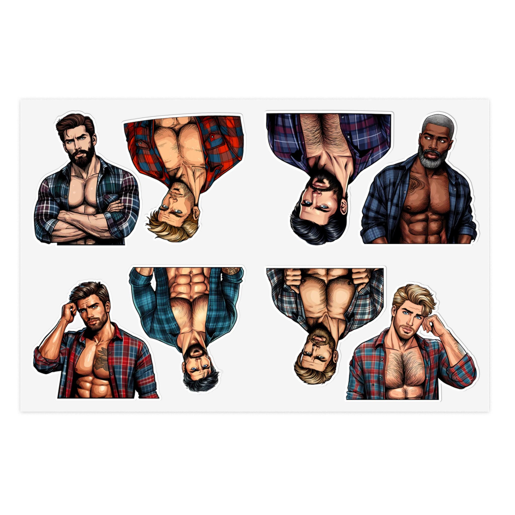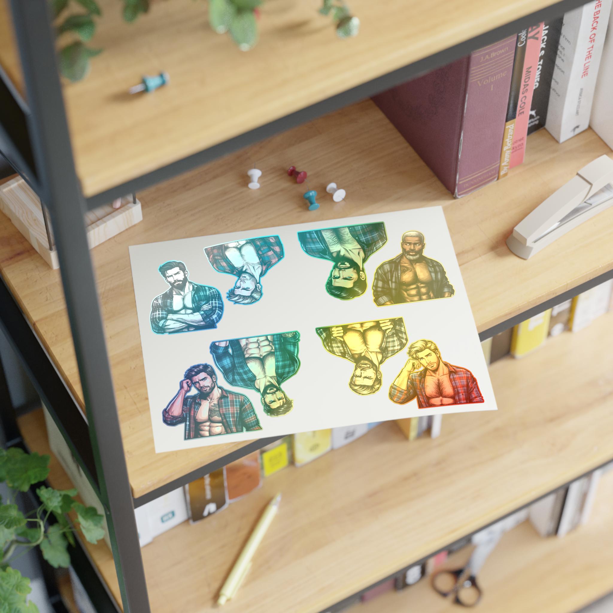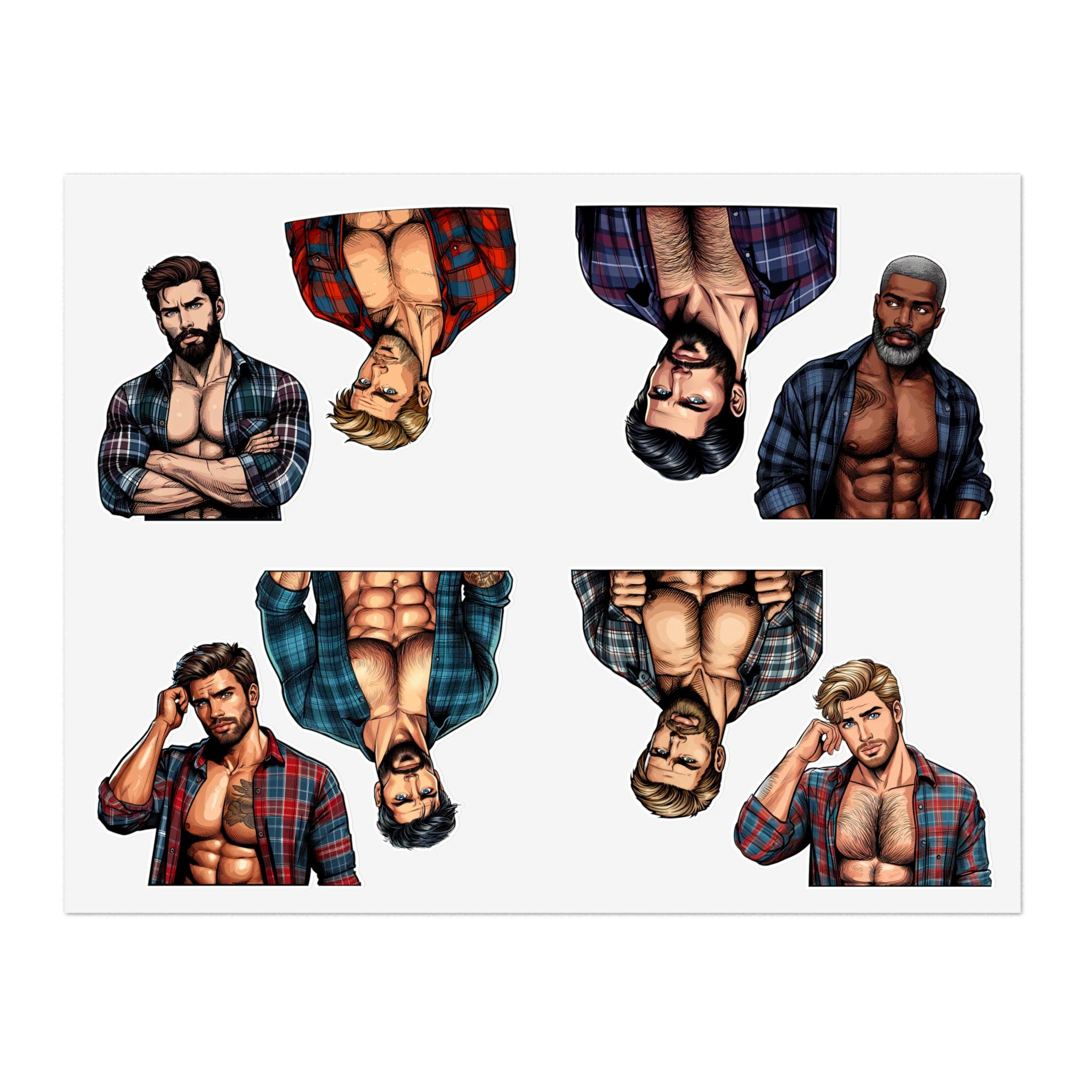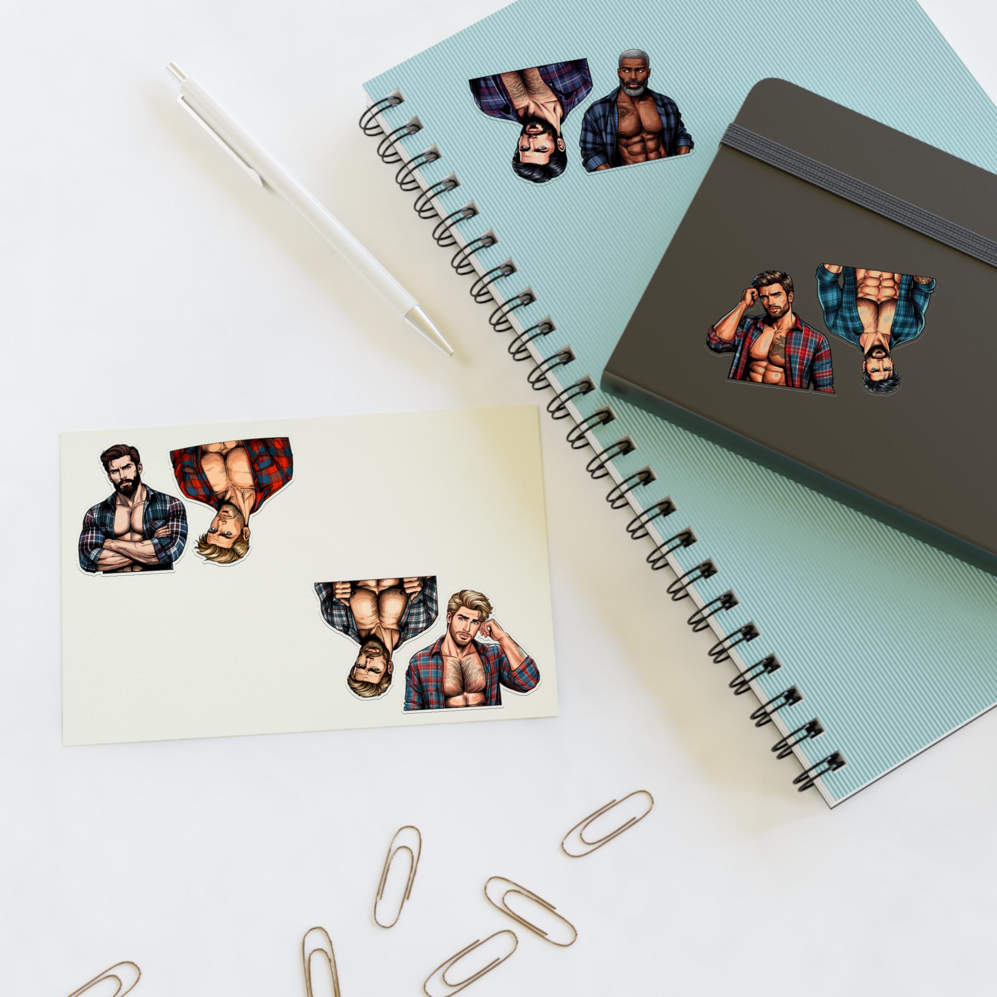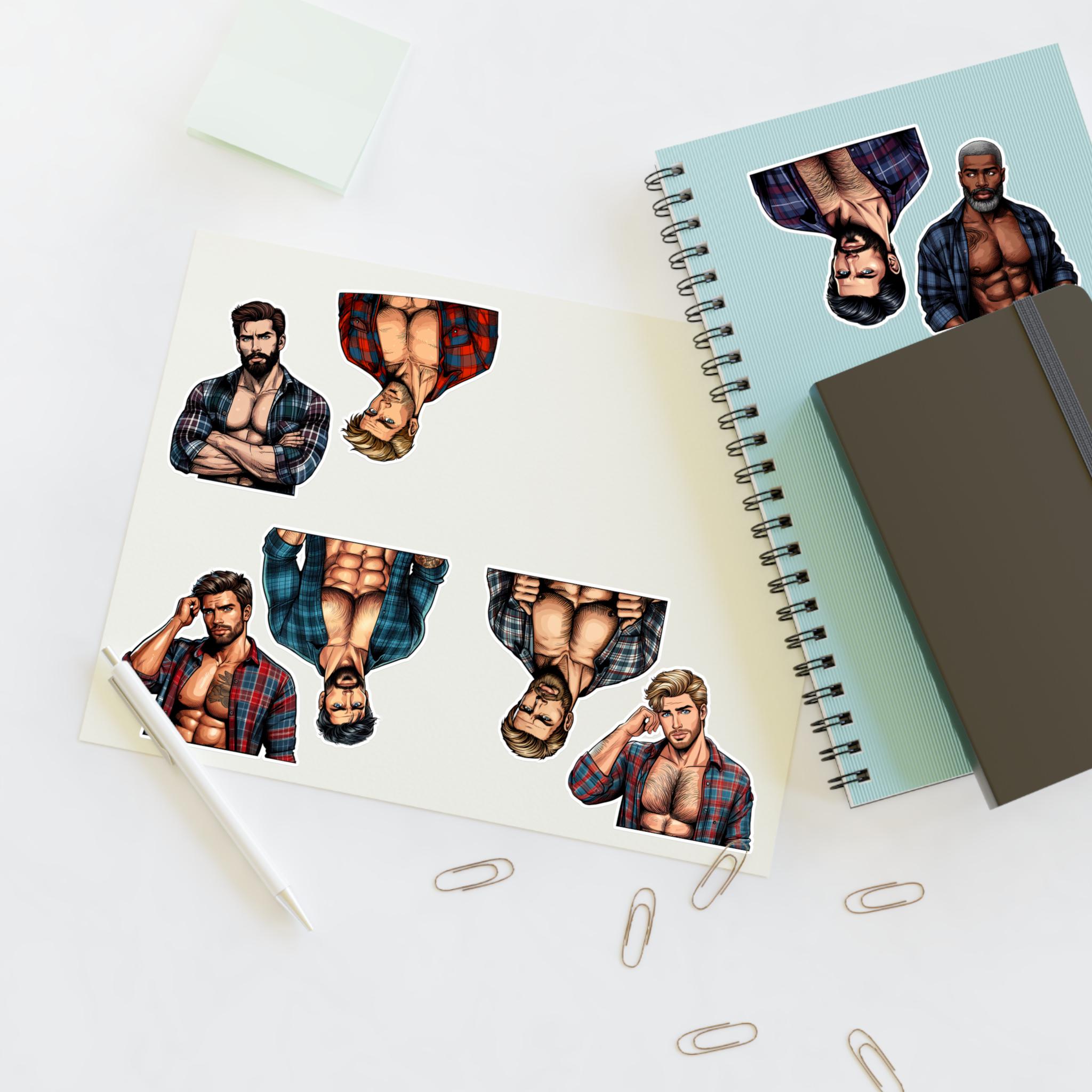 Celebrate queer joy with a sheet of bold, handsome lumberjack stickers that bring warmth and pride to journals, laptops, drinkware, and more. Each sheet features rugged, muscular queer characters — flannel, axes, and all — rendered with crisp lines and vibrant detail. These stickers hold up to everyday life: a matte laminate shields them from sunlight and scuffs, and premium vinyl keeps colors bright for years. Whether you’re decorating a scrapbook, personalizing a water bottle, or adding a playful touch to a Pride display, these decals add character and a proud, playful vibe to your space.