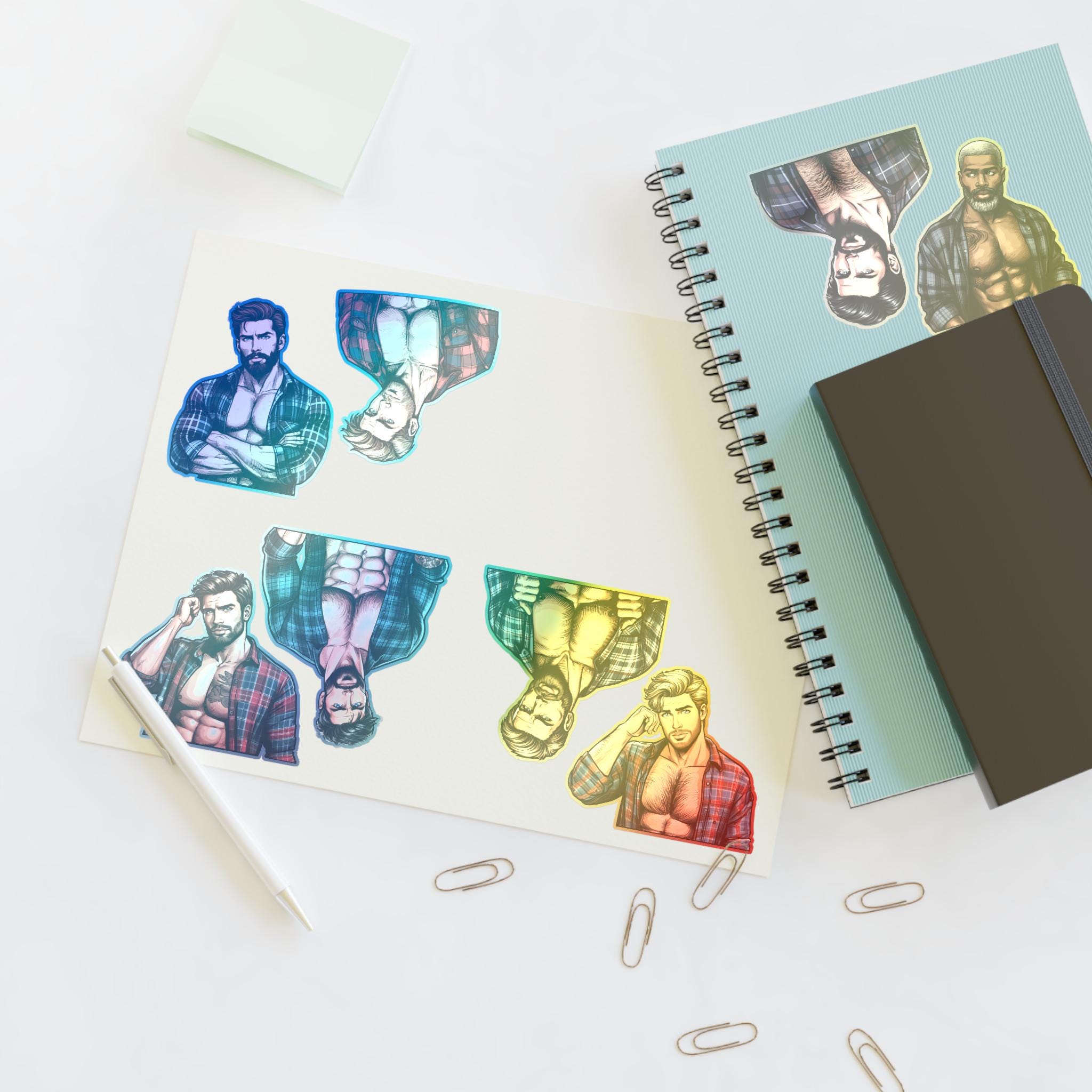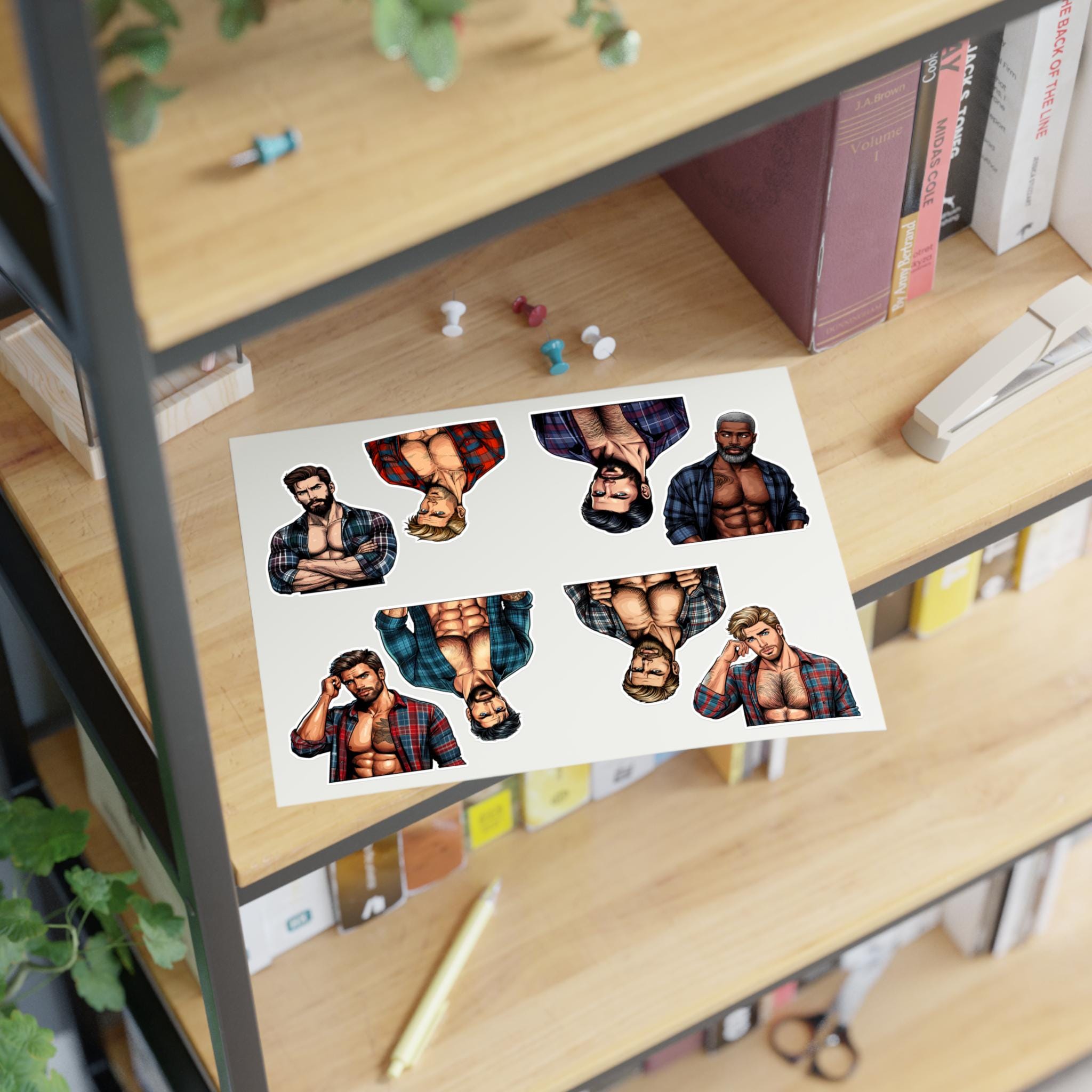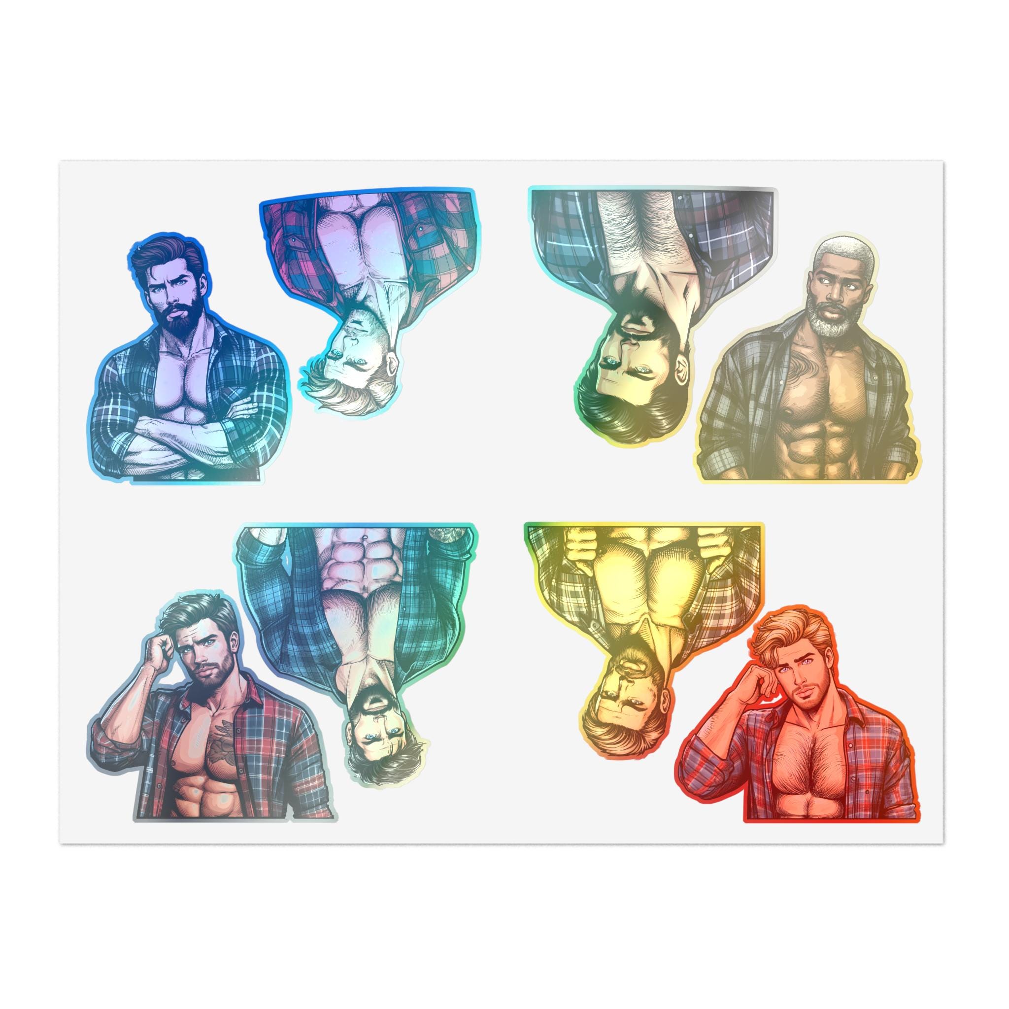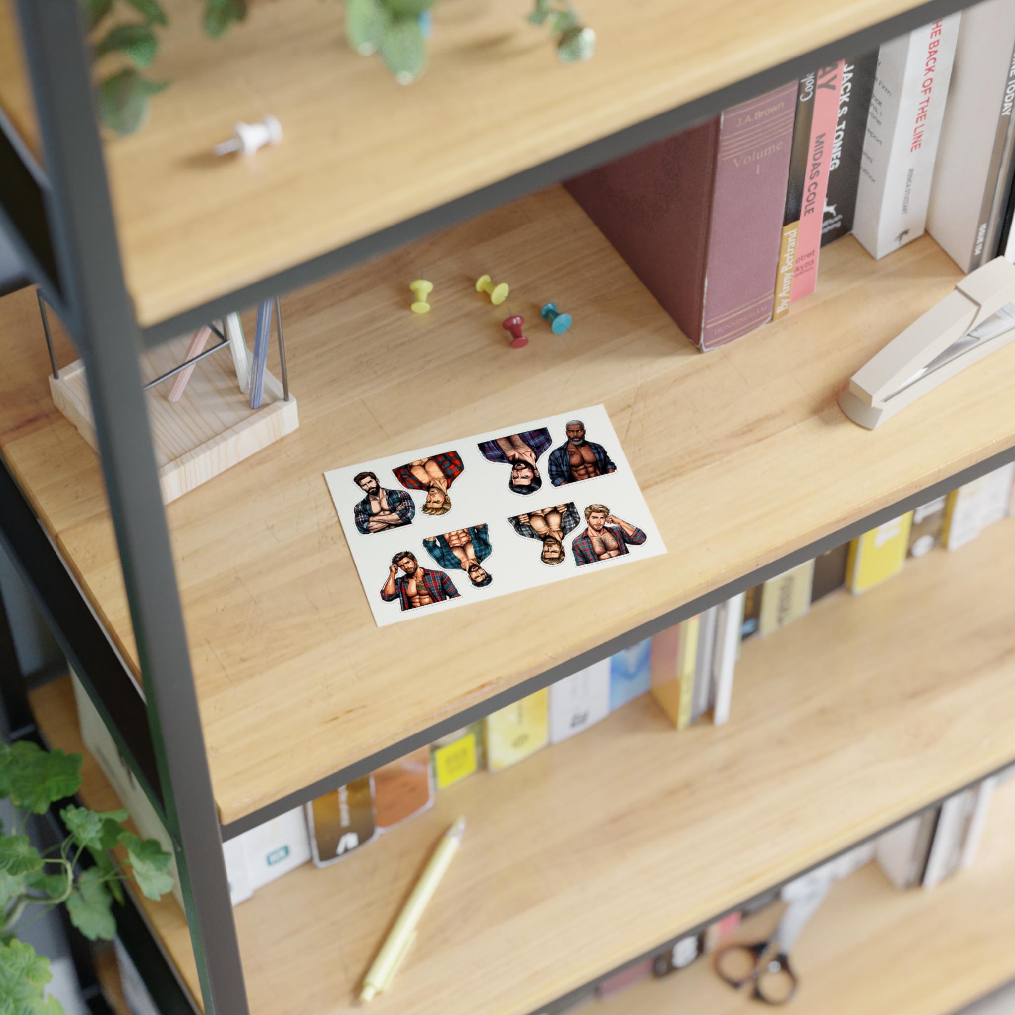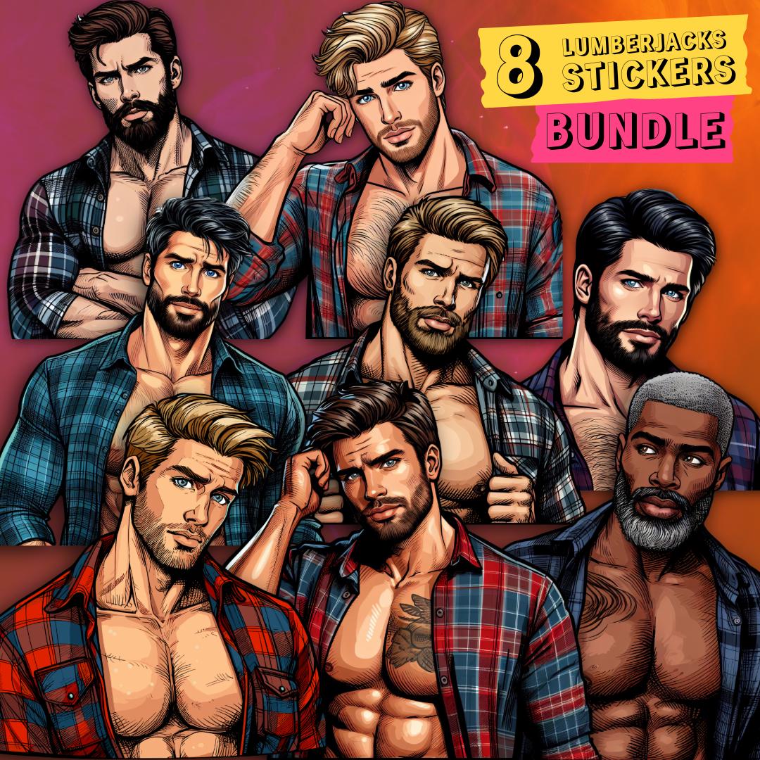 Celebrate queer joy with a sheet of bold, handsome lumberjack stickers that bring warmth and pride to journals, laptops, drinkware, and more. Each sheet features rugged, muscular queer characters — flannel, axes, and all — rendered with crisp lines and vibrant detail. These stickers hold up to everyday life: a matte laminate shields them from sunlight and scuffs, and premium vinyl keeps colors bright for years. Whether you’re decorating a scrapbook, personalizing a water bottle, or adding a playful touch to a Pride display, these decals add character and a proud, playful vibe to your space.