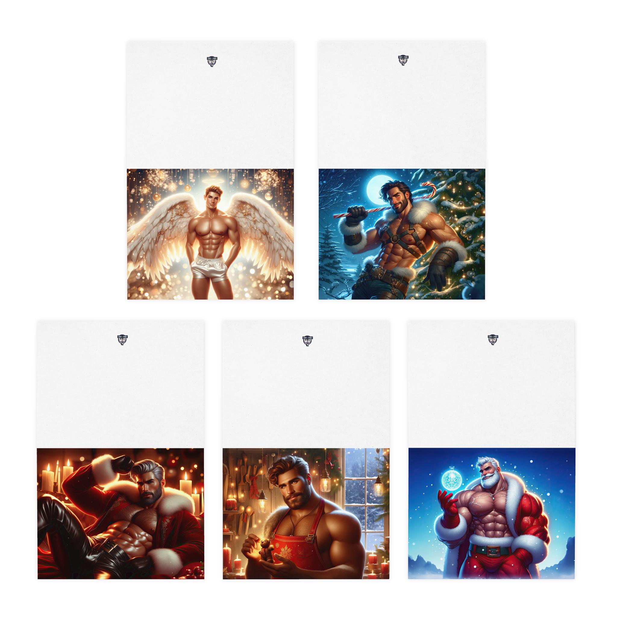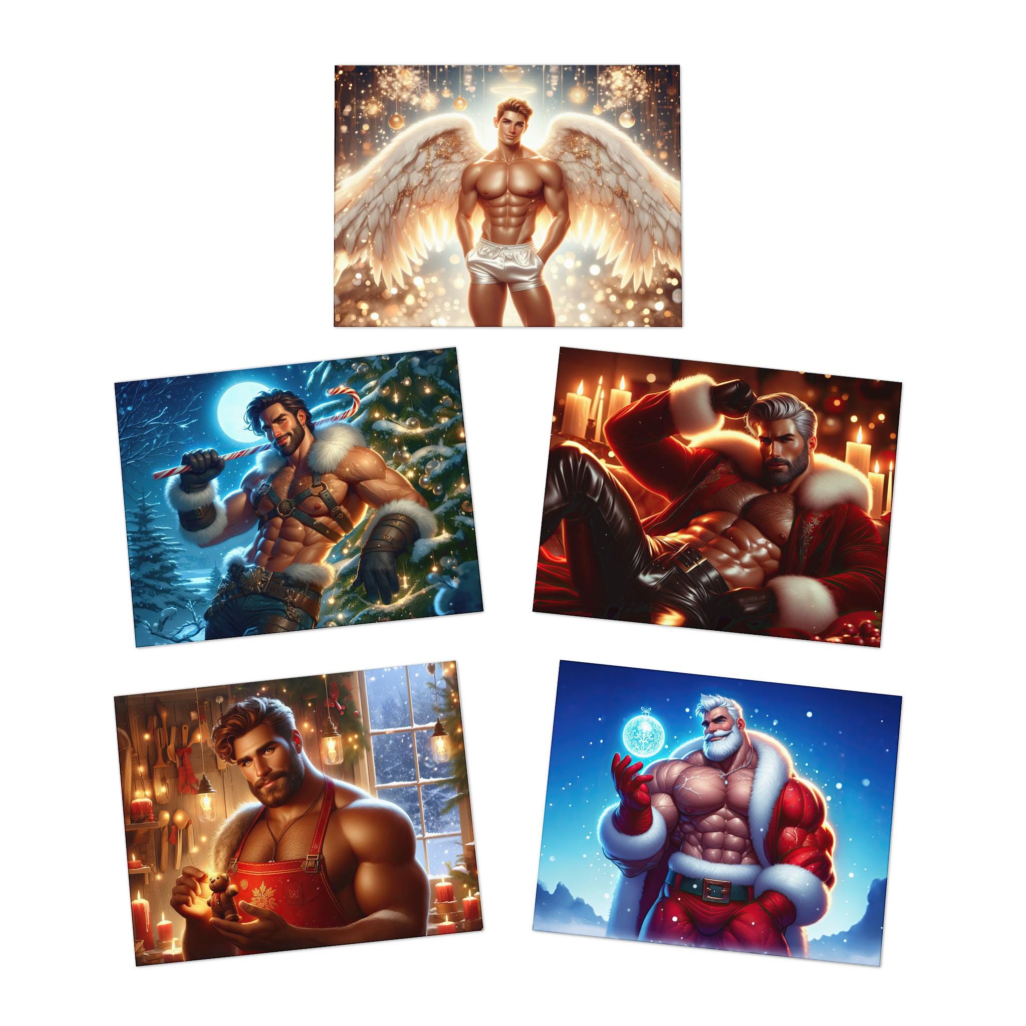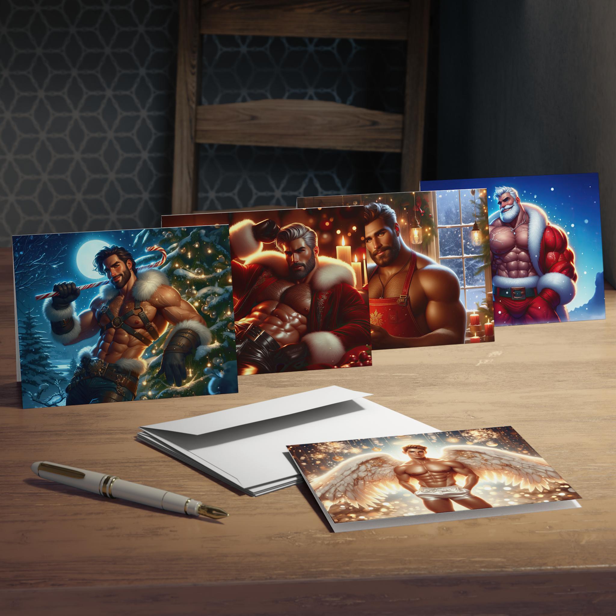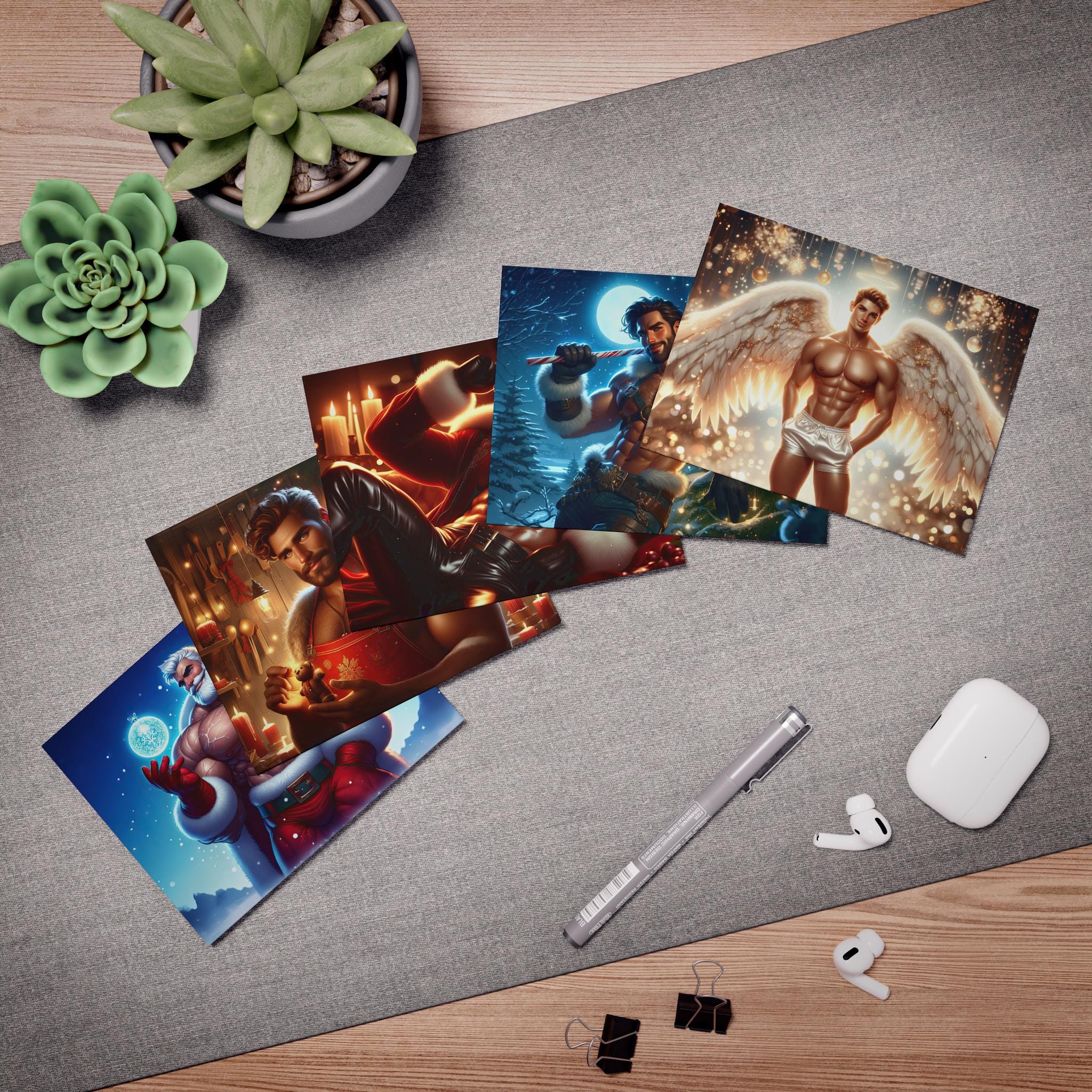 A set of five joyful holiday cards that bring retro fantasy flair and queer celebration to seasonal greetings. Bright, saturated artwork recalls vintage holiday illustrations—reimagined with inclusive characters, playful color palettes, and small fantastical details that make each card feel like a tiny story. Hold one and you can almost hear crackling holiday lights and muffled laughter; slip it into the matching white envelope and send a warm, nostalgic message to someone who cherishes queer culture, kitschy charm, and heartfelt celebration. These cards fit right into cozy winter rituals—tucked beside a mug, slipped into a care package, or left on the mantle as a cheerfully bold note of connection.