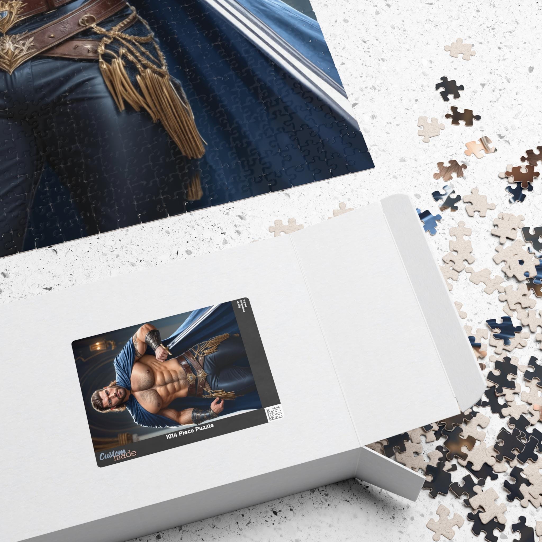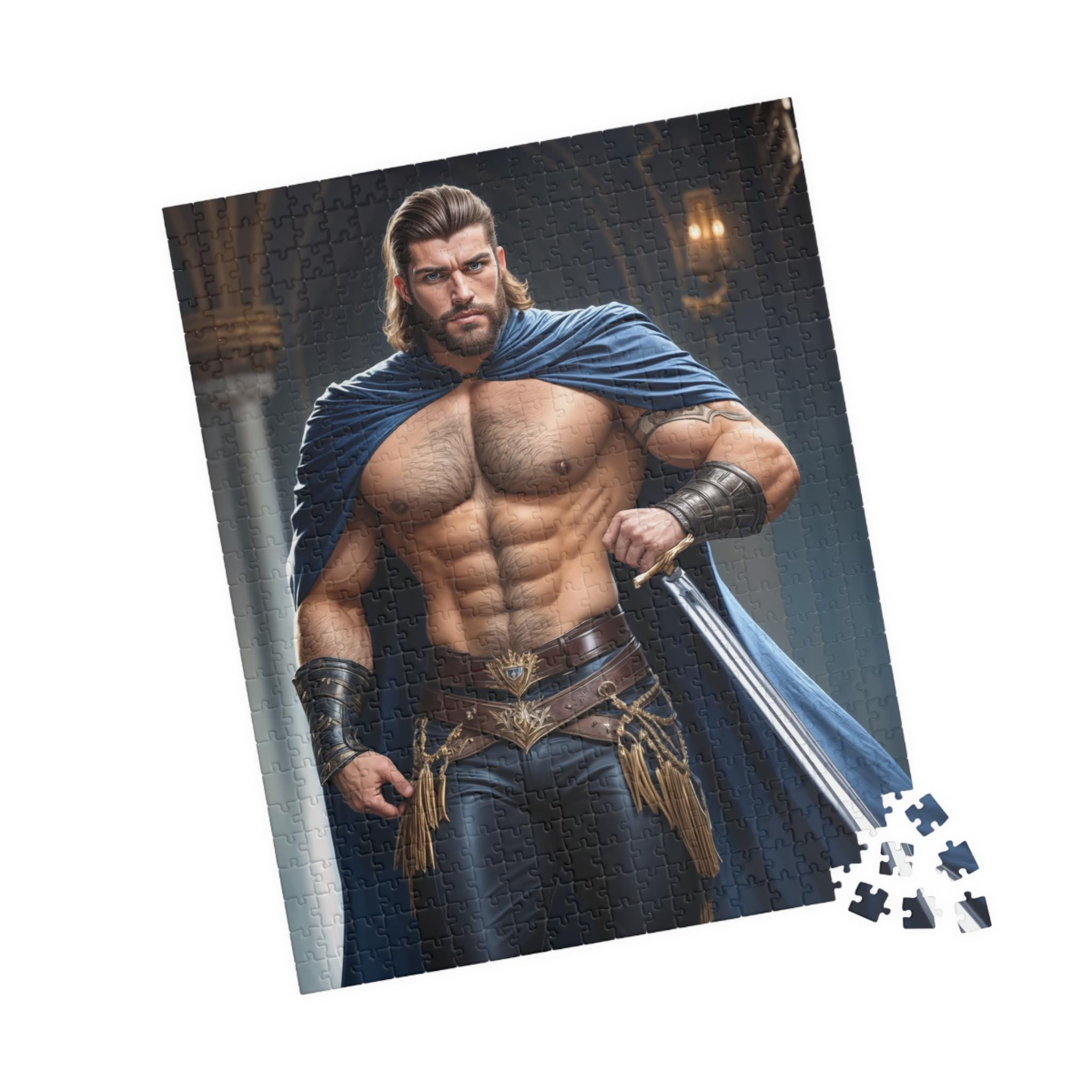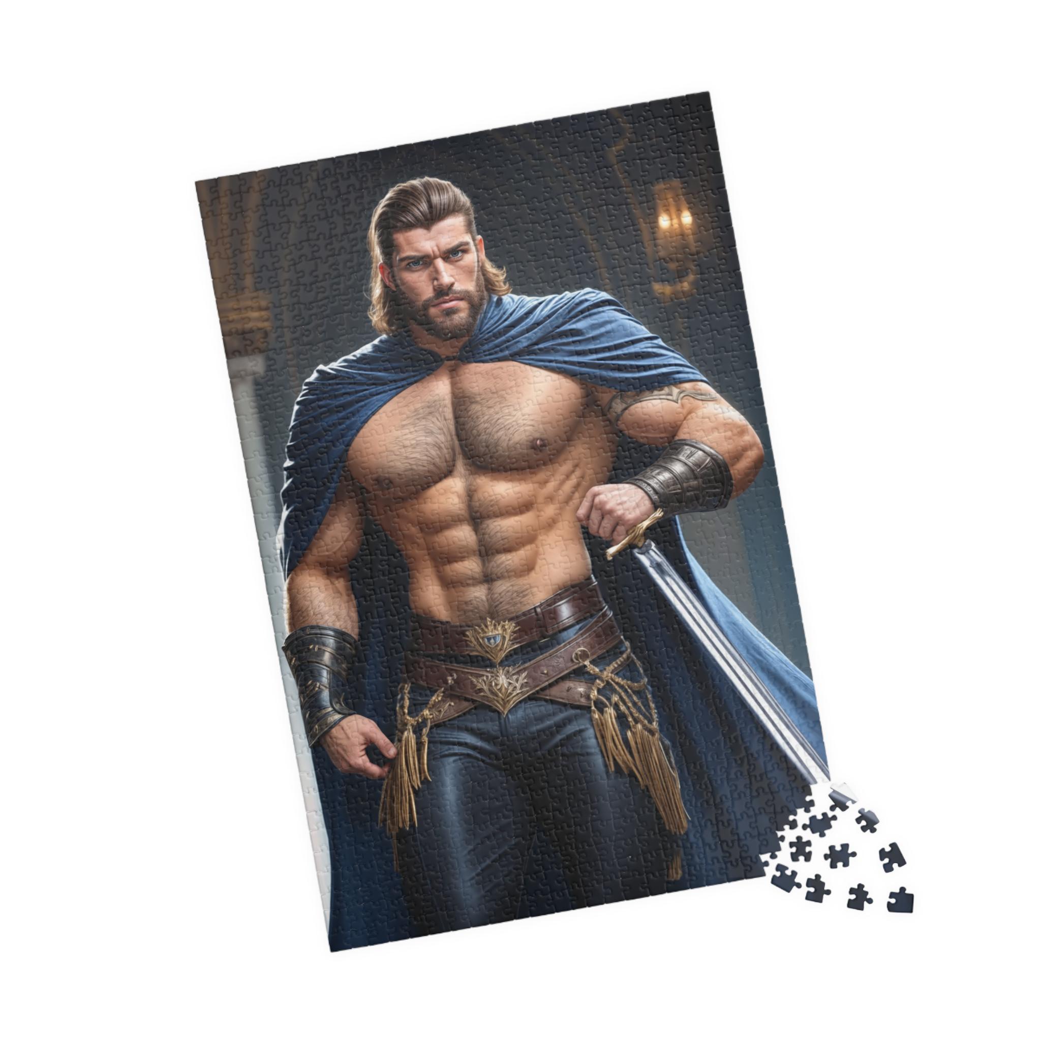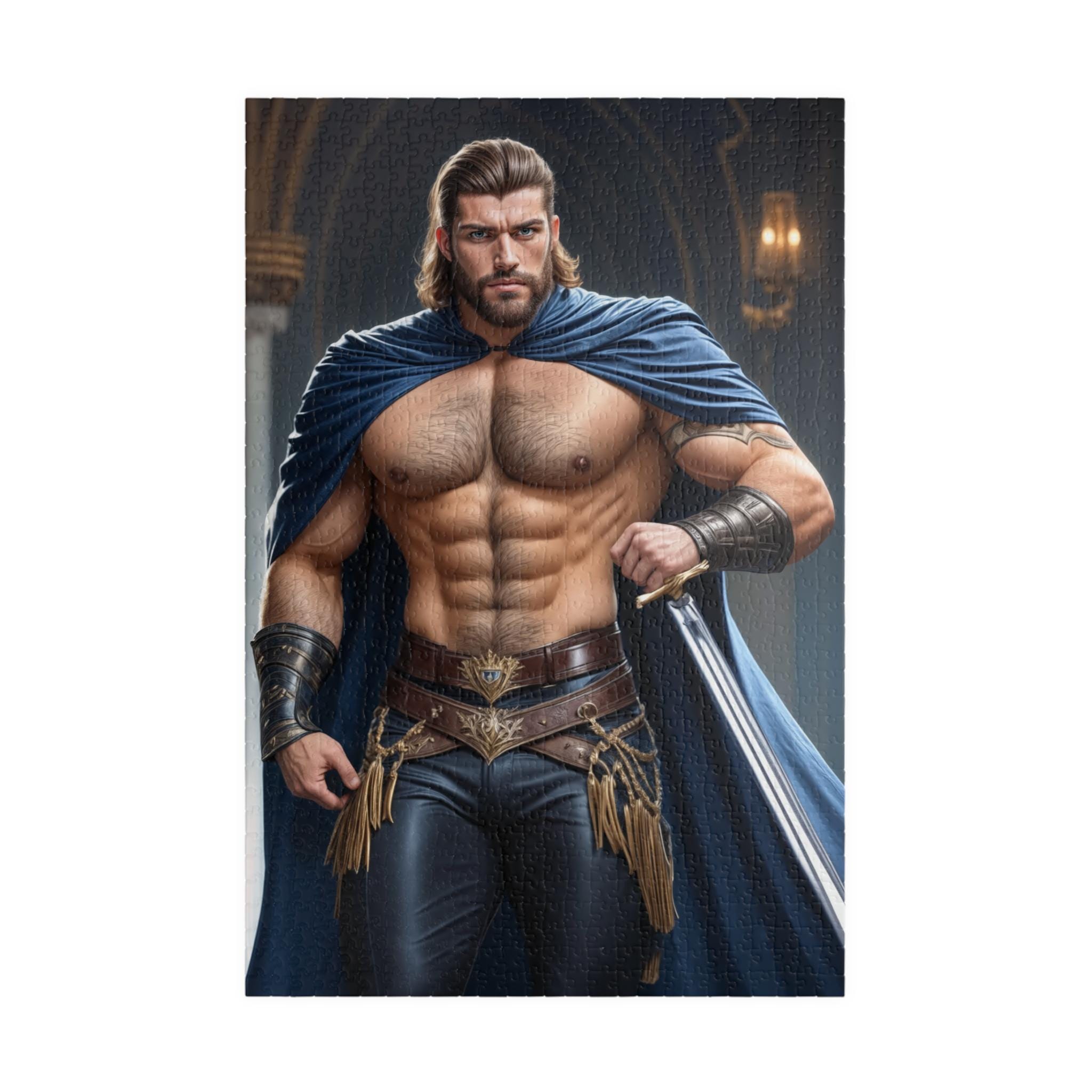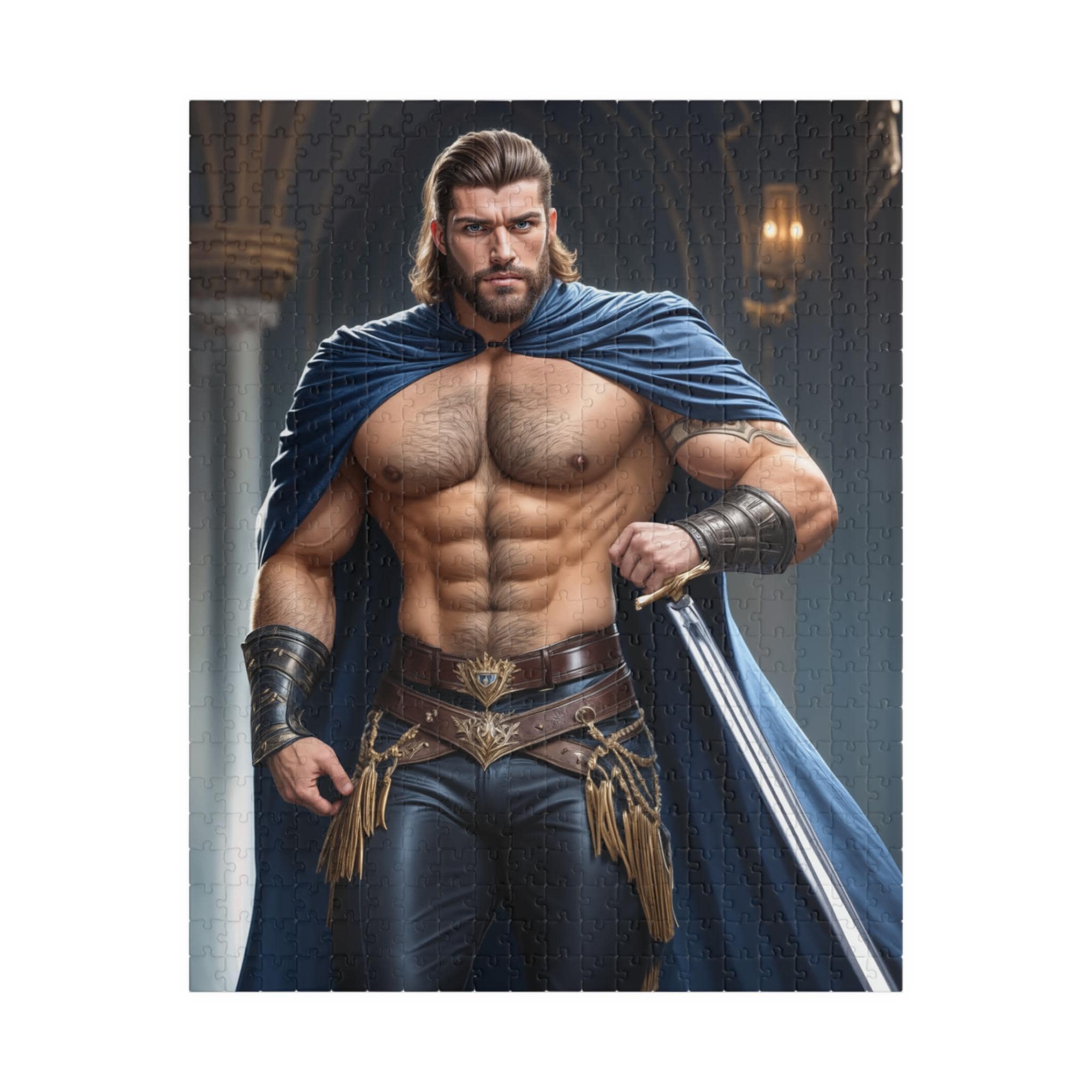 Challenging and fun Jigsaw Puzzle featuring a Gay Muscular Warrior Prince, perfect for Queer individuals looking for a brain teaser and relaxing hobby. Can be used as home decor and is relevant for LGBTQ+ celebrations and pride events.
