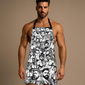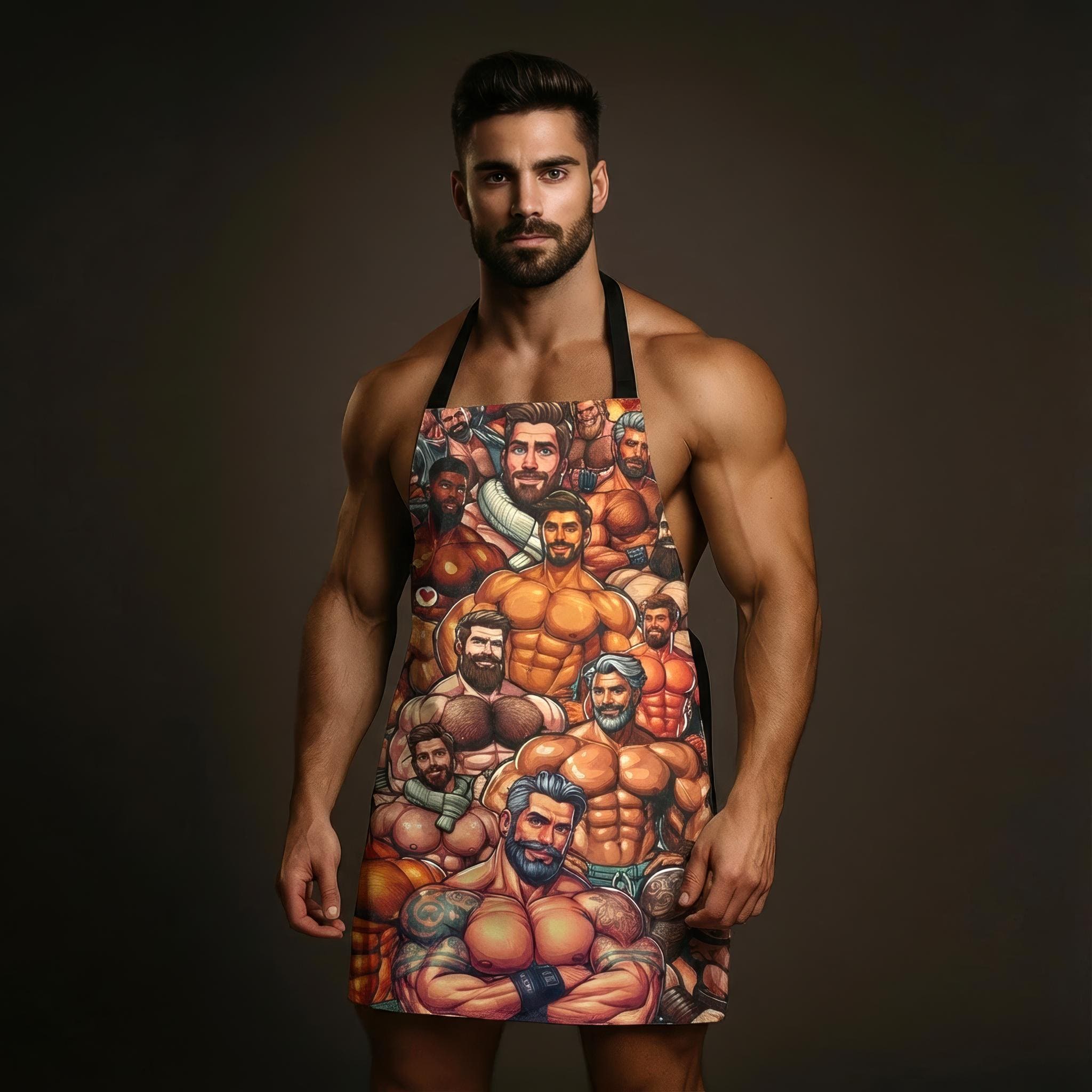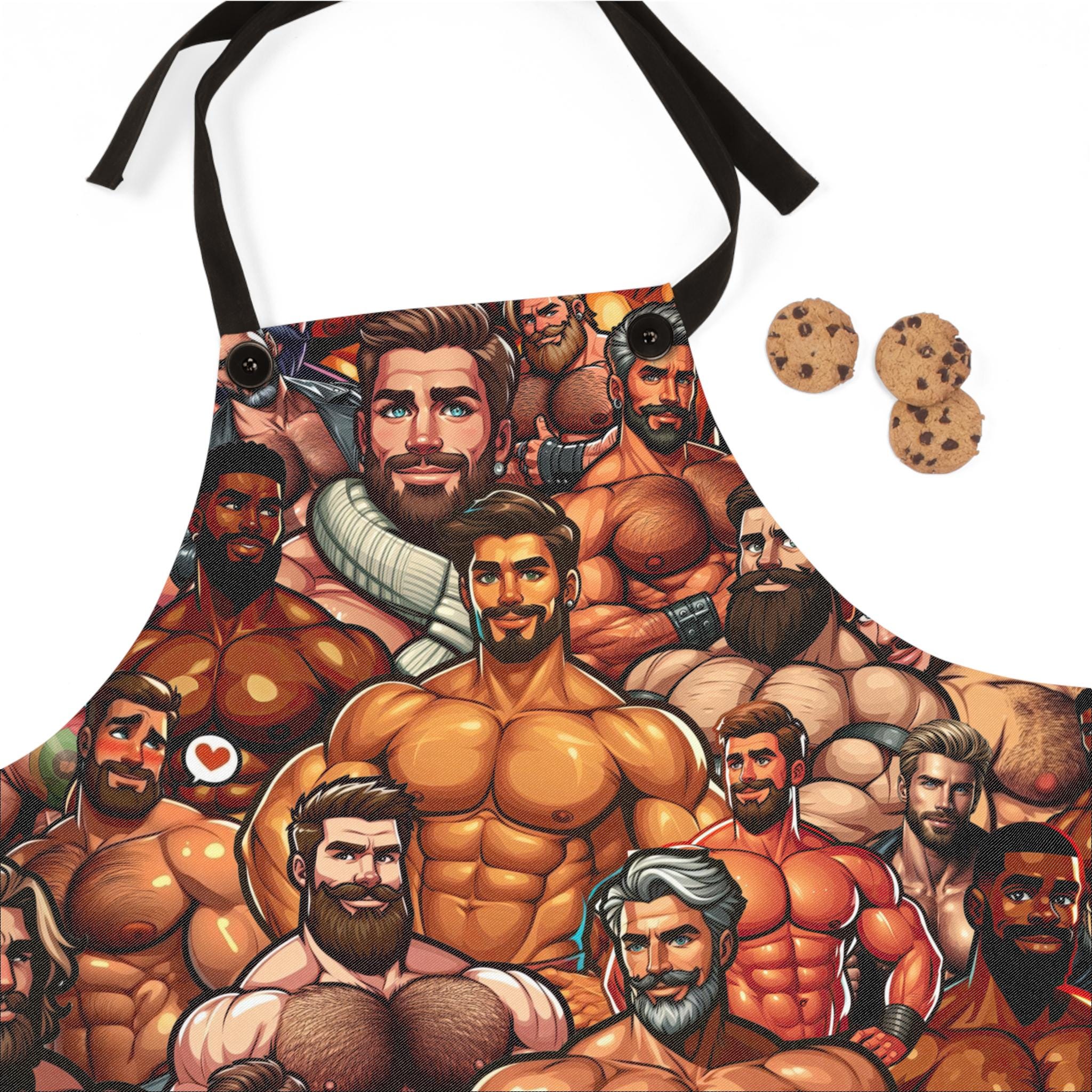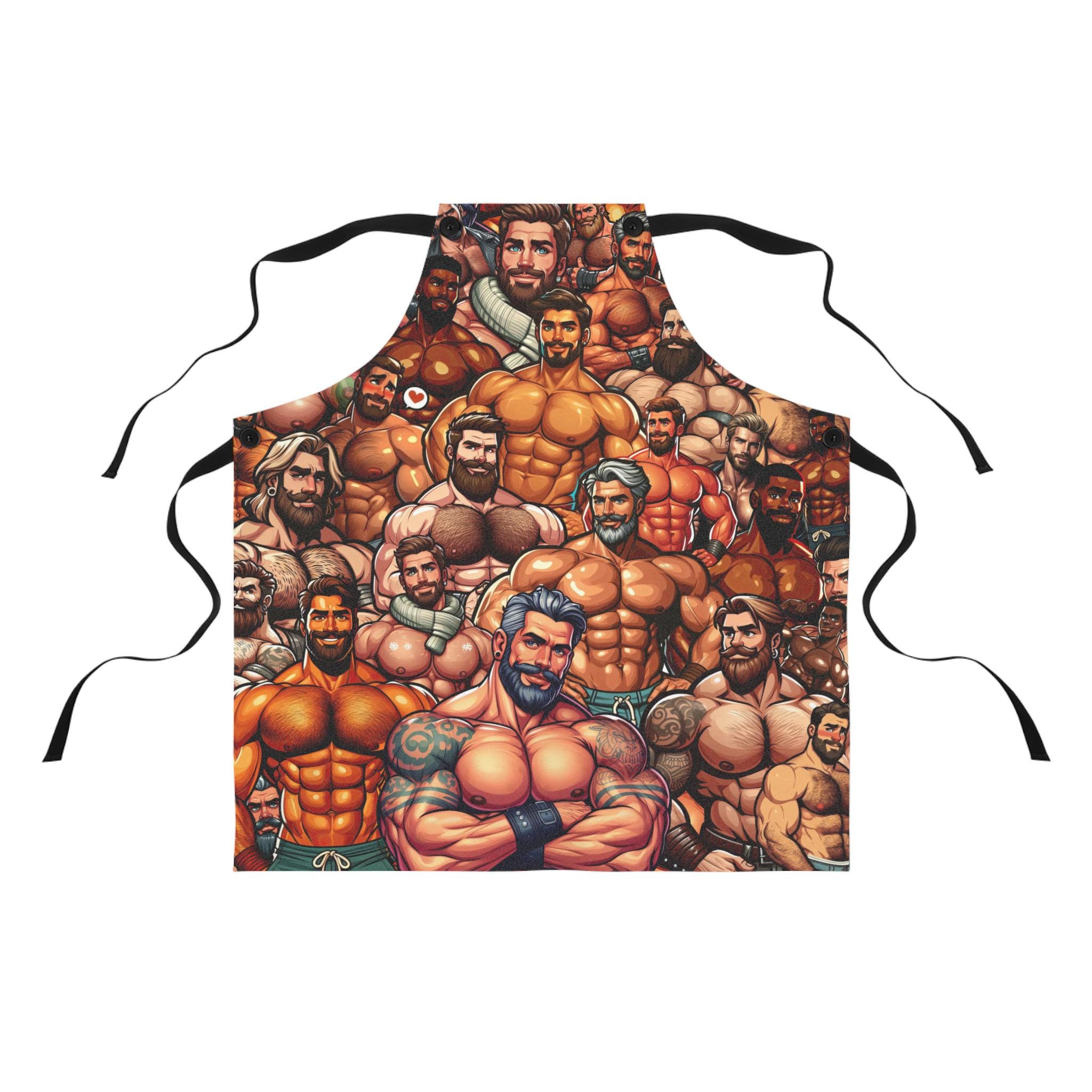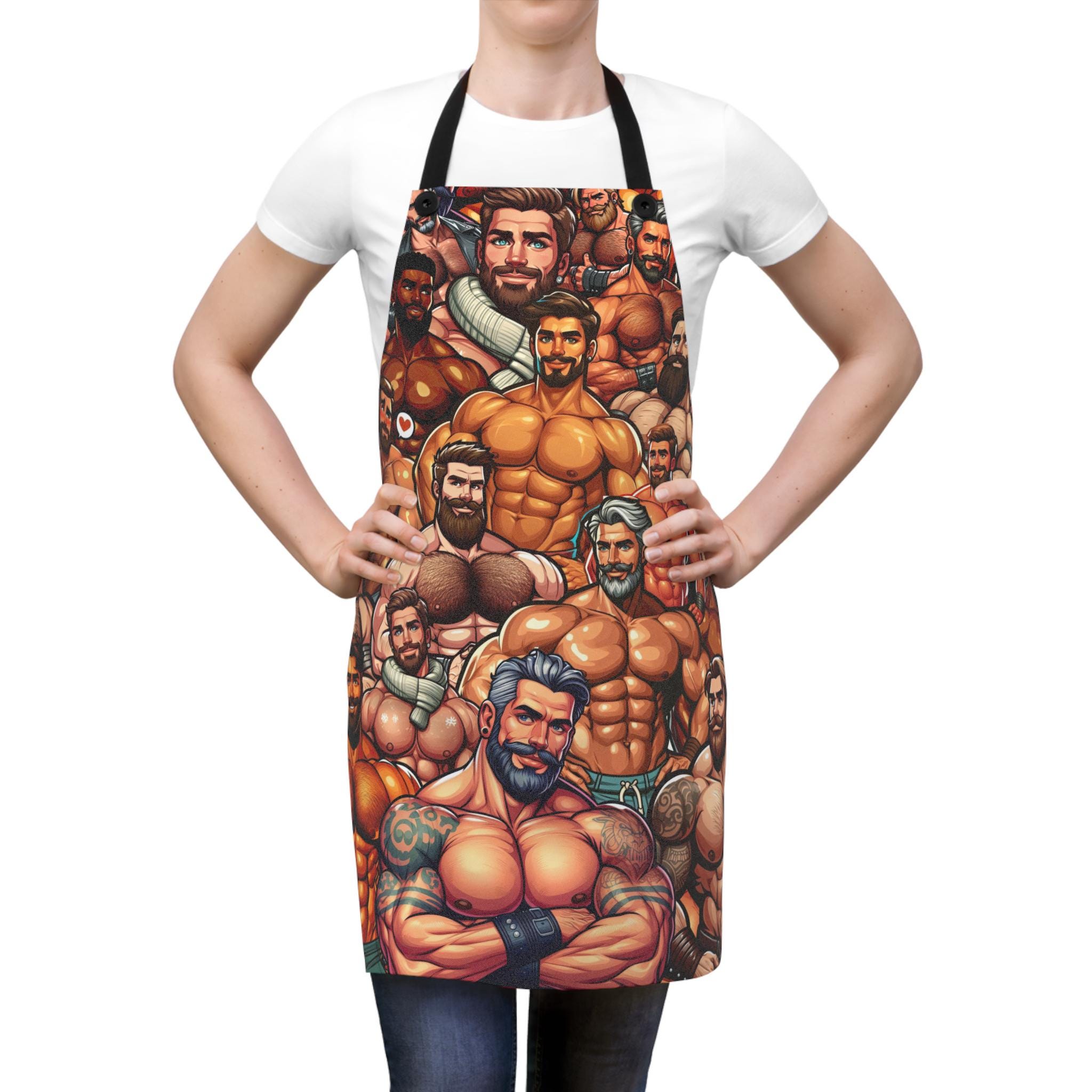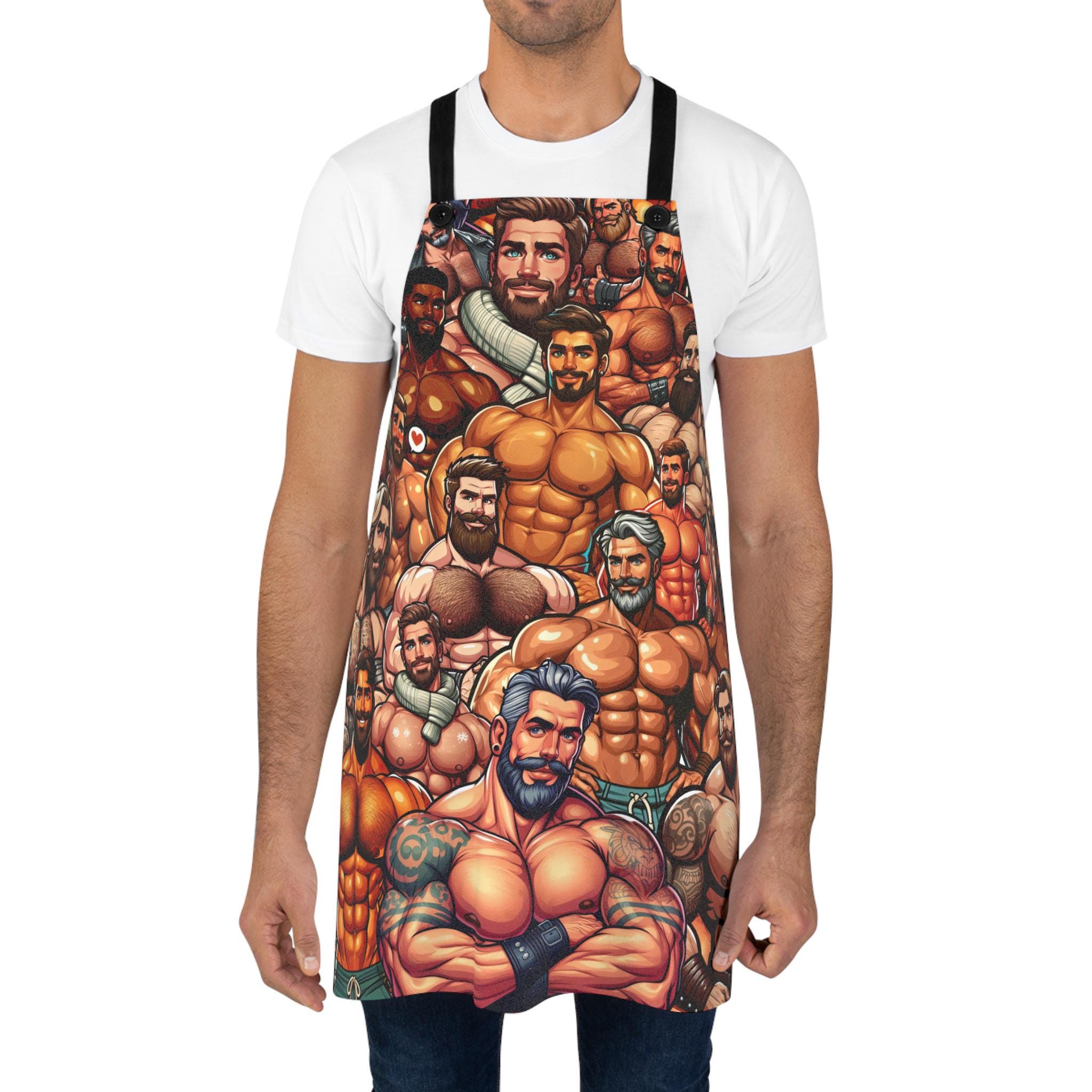 Bring a playful, confident energy to the kitchen with this bold apron. The design features a strong, muscular male figure in a proud, celebratory style—an unapologetic nod to queer joy while you cook, bake, or host. Lightweight and quick-drying, the apron moves with you through stirring, grilling, or holiday baking sessions. The detachable black twill straps let you adjust the fit or swap straps for a different look. Stitched with reinforced overlocked seams, it stands up to frequent use and washes without losing shape. Whether you’re leading a Pride-themed brunch, gifting a cheeky chef friend, or simply adding a statement piece to your own kitchen rotation, this apron brings warmth, humor, and unmistakable personality to the moment.