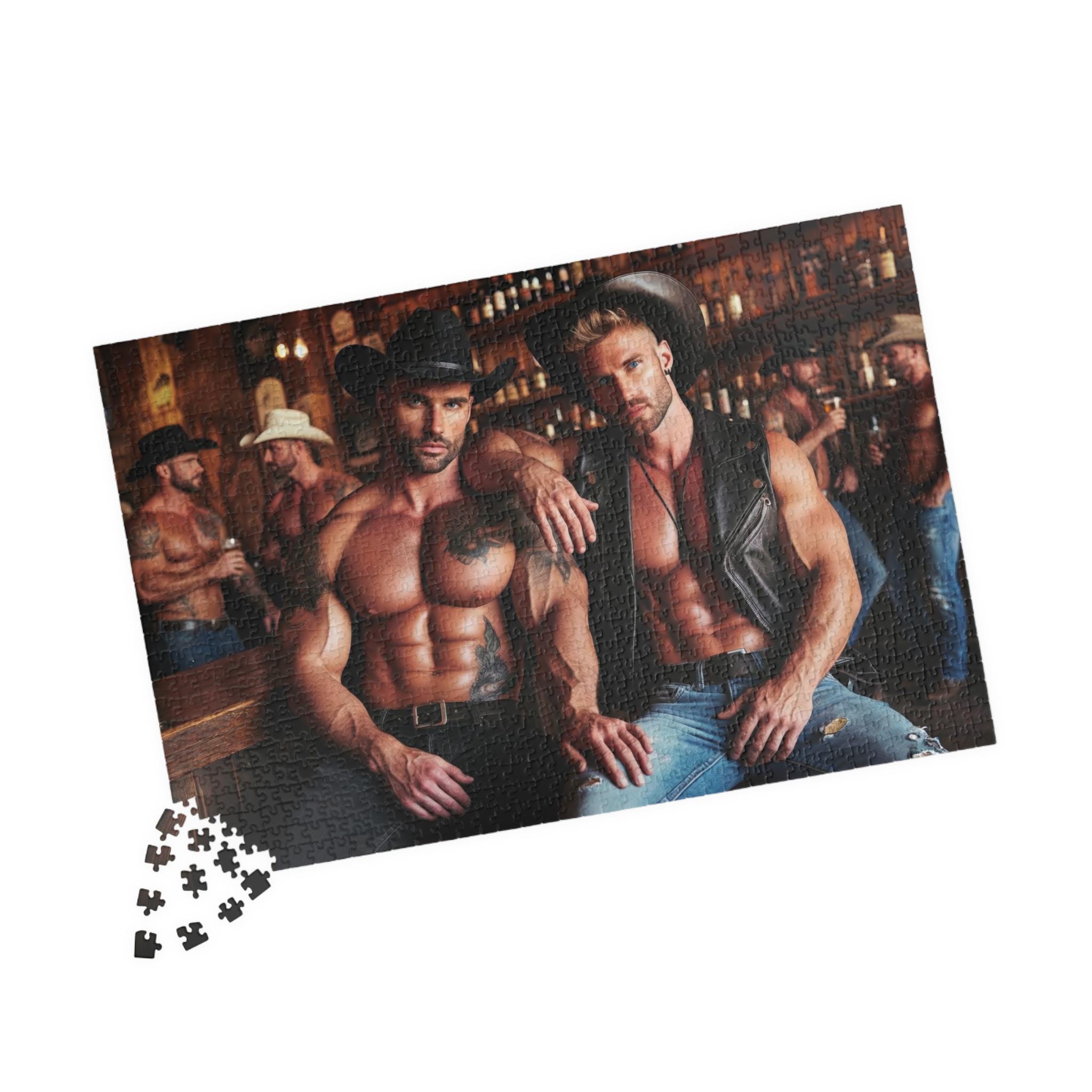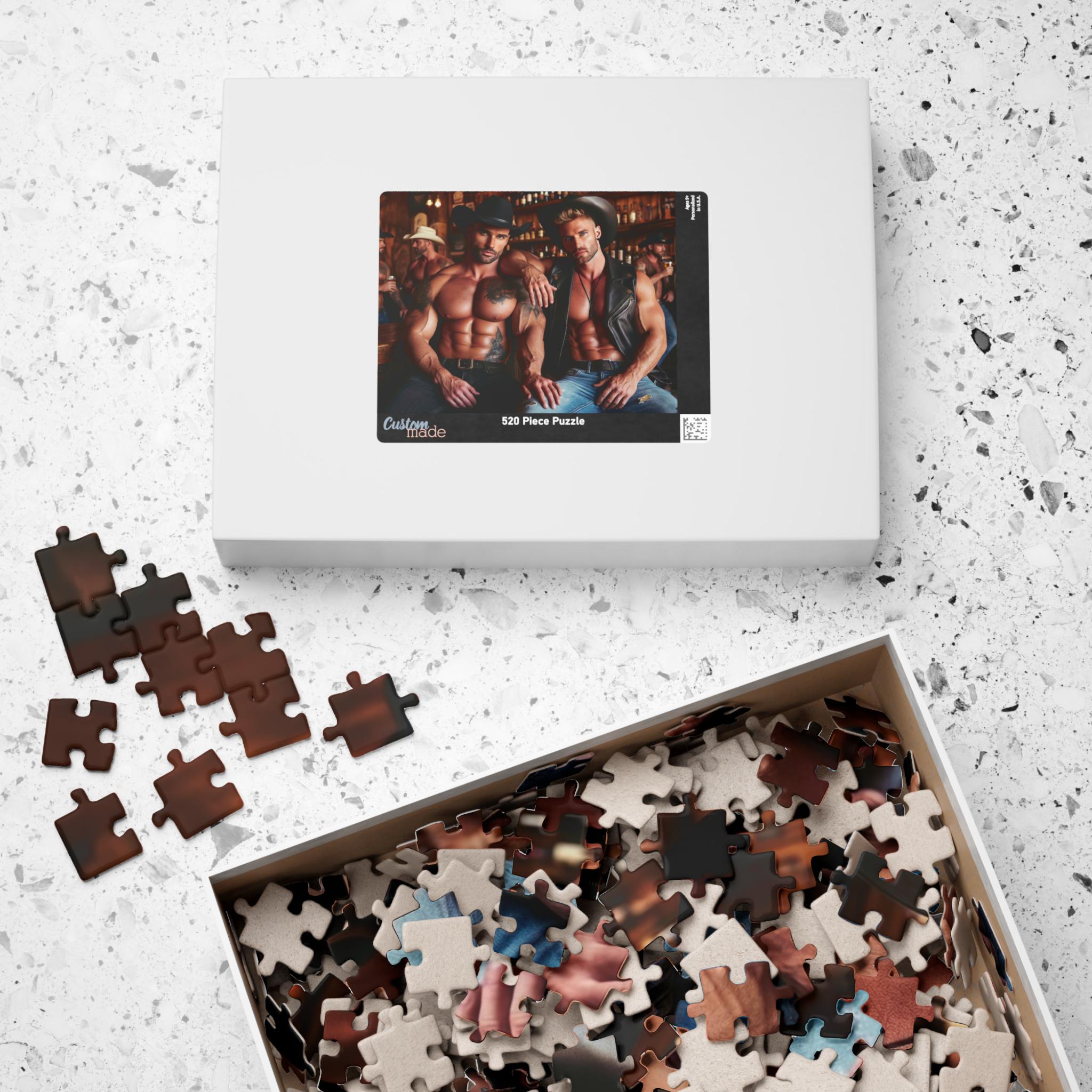 Strong hands, sunburned shoulders, and denim that has seen a lifetime of roads and ranches — this puzzle brings that heat to your table. Each piece snaps into place to reveal a bold, gay-themed celebration of muscular cowboys rendered in vivid, saturated color. Work it in the late evening with a drink, or spread it out at a weekend gathering where friends trade stories and laughter as the image comes together. The glossy finish makes highlights pop and details sing: the shimmer of metal, the grain of leather, the curve of a smile. It fits into nights when you want tactile focus and company, whether you’re easing into a slow evening alone or building something loud and tactile with friends after a long week. The orientation options let you choose the composition that suits your space — a vertical portrait for a narrow table or a horizontal layout for spreading across a living room rug. This puzzle doesn’t whisper; it invites hands-on time and celebrates a specific queer, rugged aesthetic with pride and color.